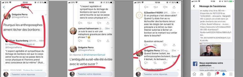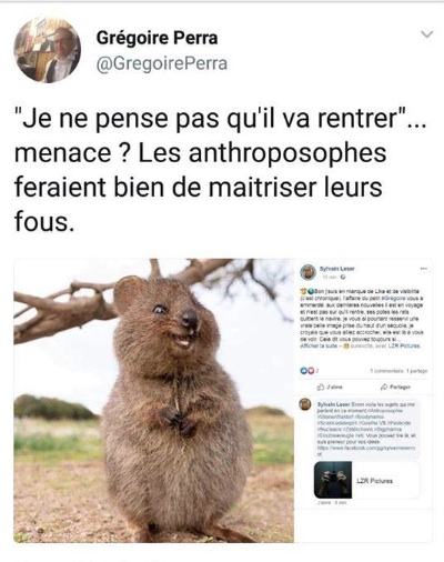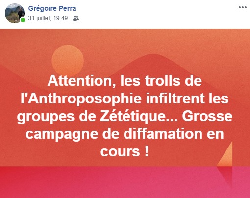 Sâen est suivie une sĂ©rie de petits bonds sur ma chaise devant son tissu dâĂ©normitĂ©s relayĂ©es partout sur la toile. Depuis, je suis assez actif sur le net, afin de voir apparaĂźtre sur le Google France autre chose que des sornettes. Le rĂ©seau de ce monsieur est infestĂ© de profils douteux, alarmistes , malhonnĂȘtes avec des petits coups bas dâinternautes qui nâont de cesse de produire des fakes, des strakles, de la pure intox et autres petites misĂšres de trolleurs. Son baratin a rĂ©ussi Ă sĂ©duire une presse qui a Ă©crit des choses inexactes et profondĂ©ment injustes. Si des journalistes font cela, quâils changent de mĂ©tier ! Je nâai rien de personnel envers ce monsieur si ce nâest ses mensonges. En revanche je dĂ©couvre sans cesse son modo de troll. Il est grand temps que les anthroposophes et sympathisants prennent leur plume et se fassent entendre sur le rĂ©seau. Je sais, ce nâest pas trop glorieux et vous avez sans doute mieux Ă faire, mais qui ne rĂ©agit pas consent. LĂ , le dĂ©bat commence Ă sâouvrir. Je suis cela de trĂšs prĂšs sur le rĂ©seau Aether oĂč des anthroposophes rĂ©pondent Ă toutes les questions concernant ce mouvement. Je trouve ces personnes formidables de patience et dâempathie, de connaissance et de savoir. Et ils nous le partagent ! Je ne veux rater cela pour rien au monde.