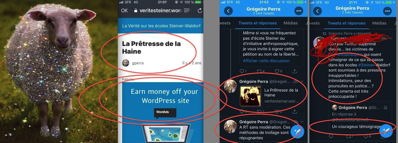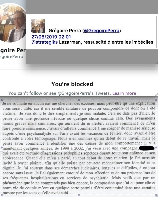 « Je vais vous le dire simplement : je suis malade. Cela ne date pas dâhier. Je pense avoir une profonde nĂ©vrose ou quelque chose comme cela. » GrĂ©goire Perra C pas vraiment drĂŽle mais tous ses soutiens Zet et compagnie te disent : C une attaque ad hominen. DĂ©jĂ lĂ tu sais Ă qui tu as affaire pour commencer, un des astroturfeurs dĂ©butants ou confirmĂ©s sauce Zet. Les types, ils te racontent que : On garde les idĂ©es et ce qui se passe sous la ceinture ou ailleurs C une attaque ! Ah ouais ? L’esprit serait donc une entitĂ© autonome, y a personne Ă la maison ? Pour des scientistes c moyen comme raisonnement. Sur une centaine d’Ă©changes parfois houleux avec ses nombreux profils fantĂŽmes sur le net, pas un n’a pris en considĂ©ration ses aveux signĂ©s. Comme quoi le mec, il est pas clair du tout. Le type, il raconte que des aveux signĂ©s sous emprise de dĂ©rive sectaire, bah ça compte pour du beurre… Pourtant il poursuit Ă deux reprises une correspondance avec la jeune fille. Je me permets tout cela Ă son Ă©gard car en fait c’est lui qui a commencĂ© en me parlant de la libertĂ© d’expression qui est une valeur Ă maintenir, alors je maintiens. Plusieurs fois il a Ă©crit dans des conversations : « ils veulent me faire du mal, ils pourraient passer Ă l’acte , je me sens menacĂ©… » Puis il insulte untel, un autre, se moque des uns et des autres sur ses rĂ©seaux trĂšs suivis… Il cherche la merde Ă tout le monde et d’un coup doit se sentir rattrapĂ© par la peur : tout le monde lui en veut, le harcĂšle, le menace, le diffame, il hurle Ă la honte Ă tout va ! LĂ aujourd’hui , d’oĂč cet Ă©crit, il parle d’une dame comme lui fĂąchĂ©e contre les Ă©coles, dont, je le rappelle, il a Ă©tĂ© virĂ© pour attouchements sur une Ă©tudiante. Cette personne qu’il mentionne aujourd’hui s’est suicidĂ©e. Triste, il dit : « si un jour on me retrouve suicidĂ©, n’y croyez pas c’est qu’on m’aura assassinĂ©.» Il se prend donc pour un repenti de la mafia, je vois pas trĂšs bien les anthroposophes, des gens bienveillants qui Ćuvrent pour la paix se lancer dans le crime organisĂ©. Allez voir par vous mĂȘme Ă la librairie ou Ă la bibliothĂšque Ă Paris ou ailleurs, vous tomberez sur des personnes le plus souvent agĂ©es, sympas et dont je crois qu’aucune sorte de violence n’est envisageable de leur part. Une sagesse semble au contraire les habiter et ce pour plein de raisons trĂšs louables. L’accompagnement de personnes diffĂ©rentes, simplement d’enfants aussi, des personnes avec une spiritualitĂ© Ă©quilibrĂ©e et accomplie, des scientifiques, des Ă©rudits etc… Nan nan tout ça c’est dans sa tĂȘte. Depuis 3 mois j’ai bien observĂ©, je suis pas le seul. Il y a Ă tout casser 5 Ă 10 personnes sur le net qui dĂ©fendent ou essayent de parer les insultes, mensonges qui apparaissent et se rĂ©petent tous les jours via des blogs, des mĂ©dias, des tweets, des vidĂ©os… etc , le tout suivi par des centaines et parfois des milliers de suiveurs. Une vĂ©ritable petite armĂ©e. L’excuse frĂ©quemment resservie de personnes isolĂ©es , fauchĂ©es et harcelĂ©es ne tient pas deux secondes mais il aime et le raconte et en rajoute. Je ne dis pas que ce type ne souffre pas. Pour sĂ»r, il ne va pas bien, mais de quoi souffre t-il ? Egocentrisme, mythomanie Ă tendance paranoĂŻaque , je vais pas vous faire un diagnostic Ă deux balles. DĂ©jĂ lisez le suivi de mes publications, les commentaires, mes jugements… etc Les nombreuses captures d’Ă©cran oĂč on voit bien qu’il agresse et dĂ©lire. Ă ce jour je ne crois plus un instant que les gens qui le soutiennent , Ă part les abrutis finis, ne sont pas conscients qu’il est un imposteur, mais ça leur sert Ă quelque-chose et vu le nombre de domaines qu’il, soit disant, dĂ©nonce, une vĂ©ritable complicitĂ© s’est installĂ©e de toutes parts. La plus importante semble ĂȘtre le rĂ©seau des ZĂ©tĂ©ticiens, je vous mets un lien de cette sphĂšre, vous constaterez que ça fait beaucoup de monde. Ces gens sont pour certains rĂ©munĂ©rĂ©s par certains lobbyes, lesquels ? Sans doute ceux en compĂ©tition avec Weleda etc… Puis les anti-sectes, farfelus ceux lĂ dites donc, des intĂ©gristes soit disant laĂŻcs. Je soupçonne aussi fortement une sorte de fratenitĂ© chez lez Zet_ Jeux de rĂŽles, dĂ©veloppement personnel, façon de parler et de bousiller leurs adversaires en ligne. TrĂšs sectaire en tous cas. Il le reproche aux anthroposophes, ils inversent.Tous les bobards graves de Greg sont repris, amplifiĂ©s et dĂ©formĂ©s : un cas d’Ă©tude, beaucoup d’honneur pour un type qui au fond ne le mĂ©rite certainement pas. Enfin il a voulu du succĂšs, il en a ! Marrant de temps Ă autre : il se met Ă parler de lui comme Jules CĂ©sar, Ă la troisiĂšme personne , un histrion histrionique ? Aujourd’hui c’Ă©tait sur ses tweets du : GrĂ©goire Perra Ă lâ »AssemblĂ©e »…Il a parlĂ©, on l’a applaudi : il , il , il… Waou il se croit arrivĂ©, on peut dire qu’il l’est en quelque sorte… Une sacrĂ©e bande de personnes assez mĂ©chantes en fait. Je crois pas qu’ils veulent le bien de l’humanitĂ© ou de leur prochain, ceux lĂ , mĂȘme si ils le prĂ©tendent. Des pros glyphosate , anti-bio anti-tout ce qui peut tirer les choses vers le haut… Et ça y va, ça trolle Ă fond , ils y croient ! Certains se disent de gauche mais sont imbriquĂ©s dans des relations avec des fachos sĂ©rieux ; il y a dans ce lot des eugĂ©nistes, des transhumanistes… Monsatan serait-il leur idole ? Il est un pion sur un Ă©chiquier et ça touche plein de sphĂšres et il rayonne fier comme Mephistopheles… Malade ? le mal ? Je suis persuadĂ© vu tout ce qu’il raconte et vous ĂȘtes bien con vous les ZĂšt si vous ne l’avez pas lu mais 