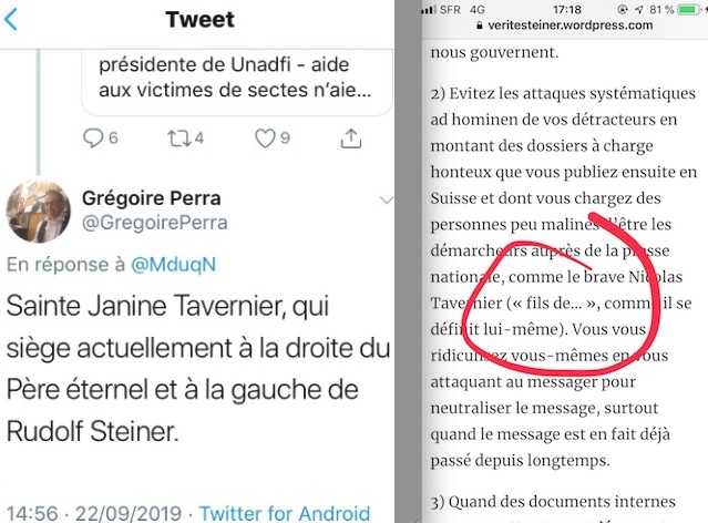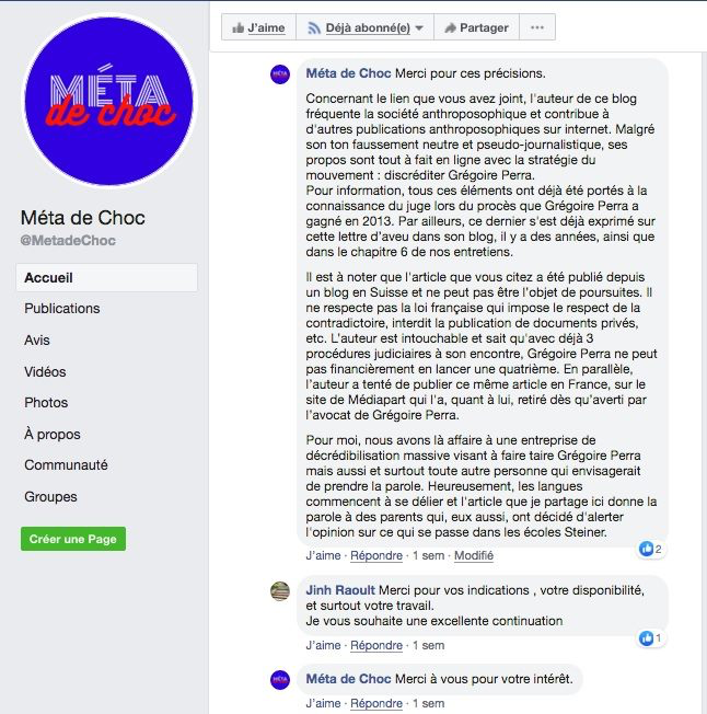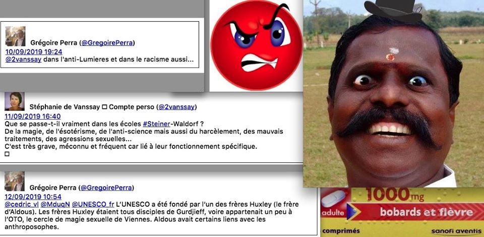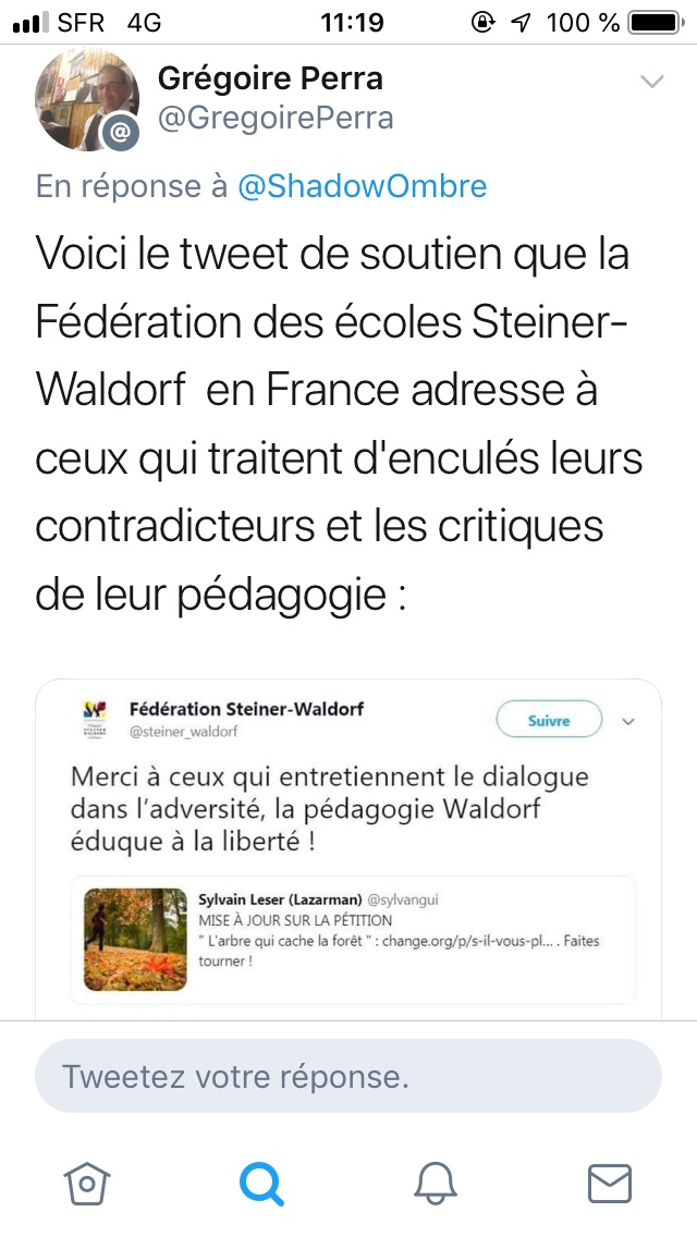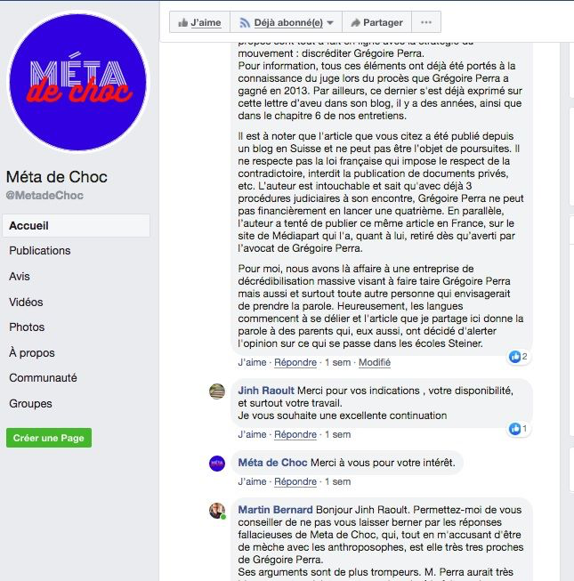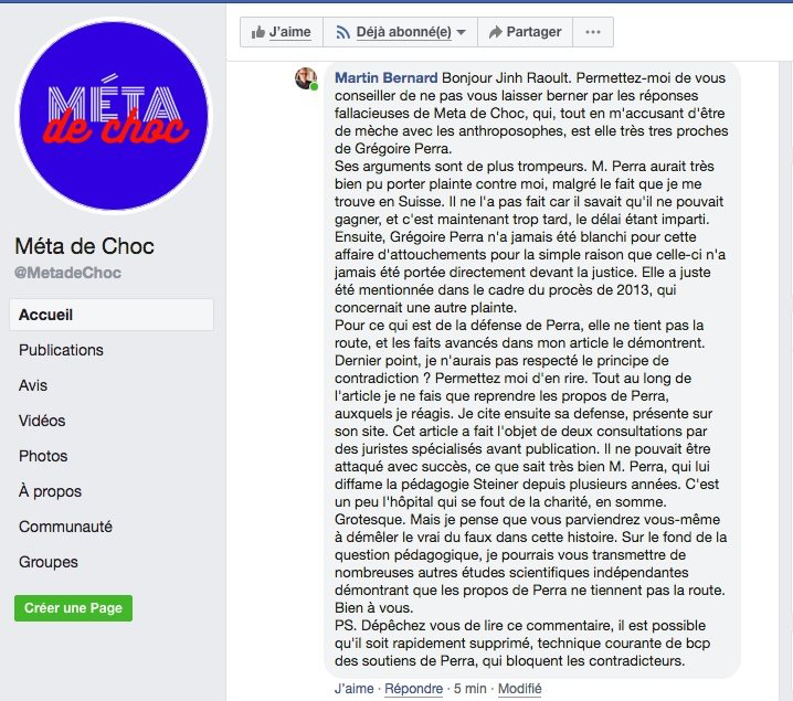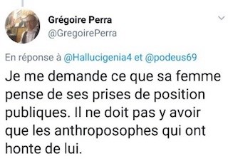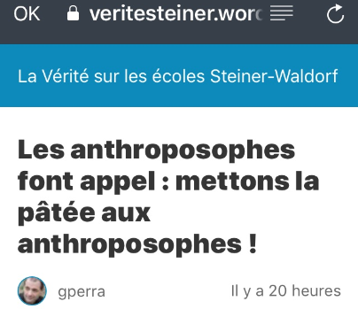 G PERRA : Vous Ă©voquez les consĂ©quences de mes Ă©crits chez ceux qui s’en emparent pour justifier leur haine des anthroposophes. Je me permet de vous renvoyer Ă la votre en diffusant et en prĂȘtant du crĂ©dit Ă l’article de Martin Bernard. Je reçois aujourd’hui environ 5 messages d’insultes par jour. Et s’il m’arrivait quelque chose ? Et si le paragraphe que vous aviez Ă©crit et publiĂ© Ă mon sujet Ă©tait perçu par quelqu’un comme une justification de sa haine et de son passage Ă l’acte ? Bonne rĂ©flexion !