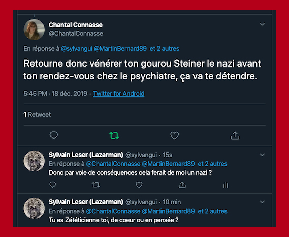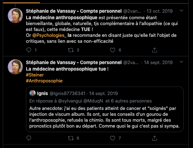 Mais en dessous, cachĂ©, masquĂ©, cela a gĂ©nĂ©rĂ© plus de 2000 tweets! et 25 000 affichages du tweet. C’est complexe et pas Ă©vident de sây retrouver. Mais je, « on », commence Ă sây faire , je dis « on » car il y a des anthroposophes extrĂȘmement patients sur cette conversation et trĂšs brillants : des ZĂ©tĂ©tichiens et autres pseudo-scientifiques venus entamer un dĂ©bat dâidĂ©es trĂšs constructif, c’est passionnant, du haut vol.