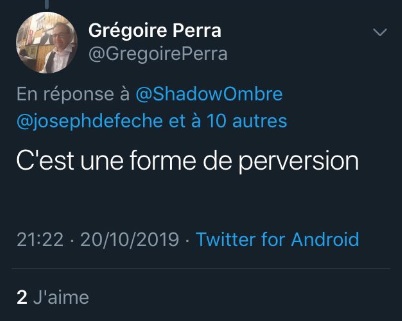 EV : Je suis outrĂ© totalement et Ă©cĆurĂ© par ces horreurs mensongĂšres. Mais quel ĂȘtre est-il donc pour pouvoir inventer toutes ces inepties? Moi aussi je suis bloquĂ© par ce Monsieur. J’ai osĂ© l’interpeller et ne pas me montrer « ami » mais critique! Comment peut-on en arriver lĂ ! Devoir dĂ©penser tant d’Ă©nergie Ă se dĂ©fendre pour pouvoir penser, exister, travailler et mener des recherches sans ĂȘtre taxĂ© de fou, de pervers, de manipulateur et j’en passe! Monsieur Perra, n’avez vous donc rien d’autre Ă faire? Je vous plains!