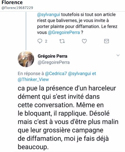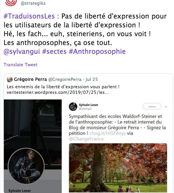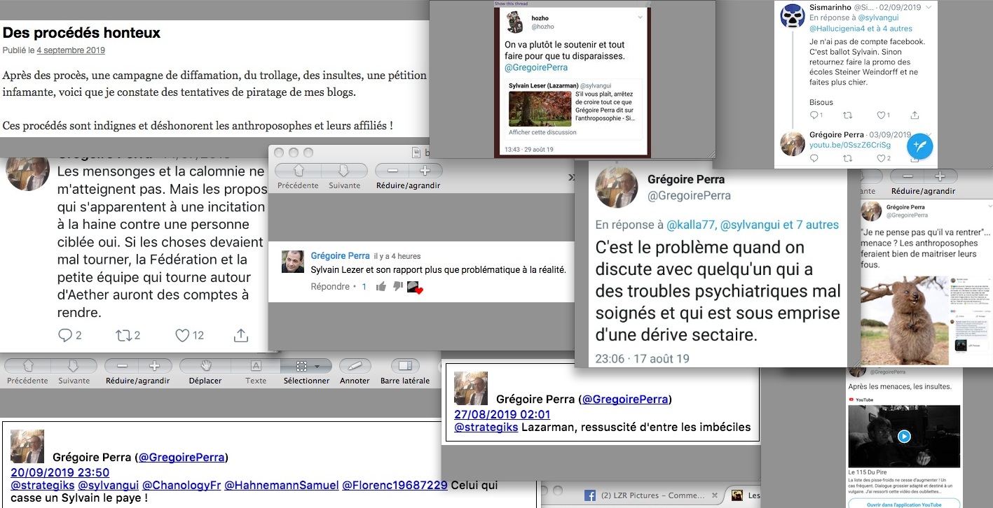 FB : Merci, Sylvain, pour cette prise de position par rapport Ă G. Perra et pour le lancement de la pĂ©tition. J’ai fait la mĂȘme expĂ©rience concernant son incapacitĂ© Ă accepter la libre expression. Voyant que personne, sur internet, ne prenait la parole pour dĂ©noncer le caractĂšre insultant et parfois carrĂ©ment mensonger de ses Ă©crits, je me suis risquĂ©e Ă Ă©crire un paragraphe Ă son propos dans un article de mon blog en novembre 2017. Une semaine plus tard, il me « gratifiait » d’un article sur son blog, ayant pour titre « la prĂȘtresse de la haine » (titre tellement gros que cela dĂ©montre surtout l’Ă©normitĂ© de son propre problĂšme), attaquant de suite dans le domaine dont il sait que c’est le plus sacrĂ© pour moi, puis suivant son habitude, sous le niveau de la ceinture…. Cet « article » contient aussi plusieurs mensonges, notamment concernant mon fils. Il se termine par des menaces vis-Ă -vis des anthroposophes qui, Ă ma suite, oseraient s’Ă©lever contre lui… Et comme par hasard, je suis bloquĂ©e sur son compte Twitter, alors que je n’y suis encore jamais intervenue.