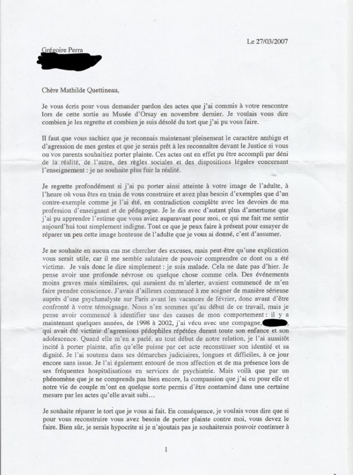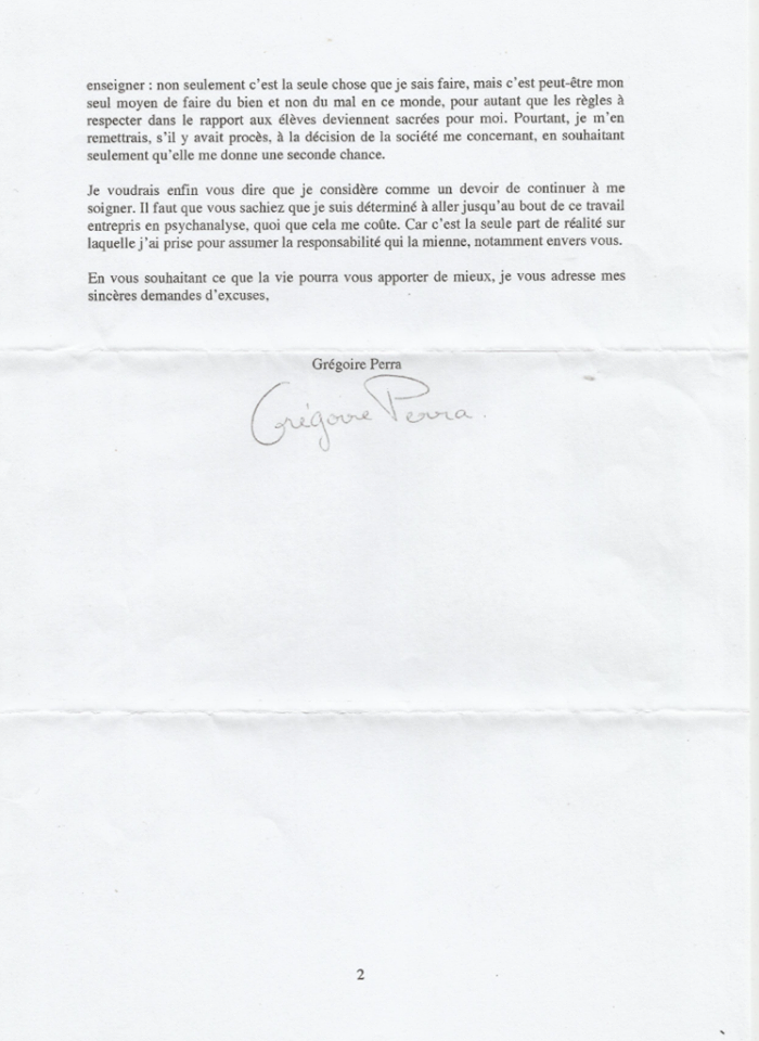 « Il faut que vous sachiez que je reconnais maintenant pleinement le caractĂšre ambigu et dâagression de mes gestes et que je serais prĂȘt Ă les reconnaĂźtre devant la (sic) Justice si vous ou vos parents souhaitiez porter plainte. » Plus loin, il Ă©crit encore :