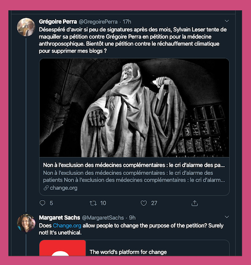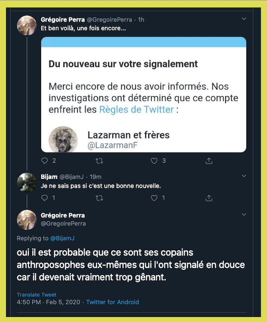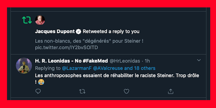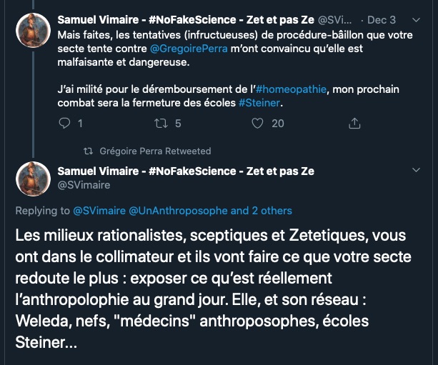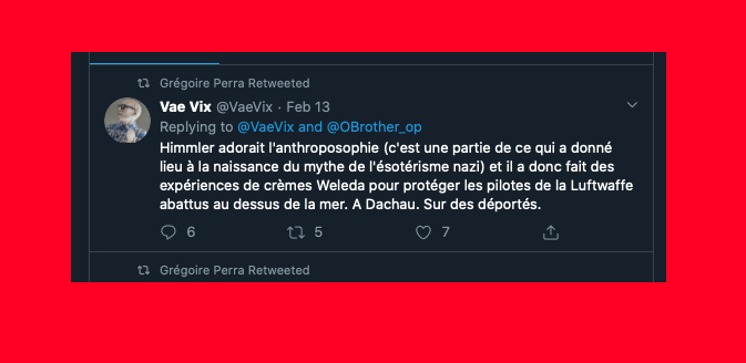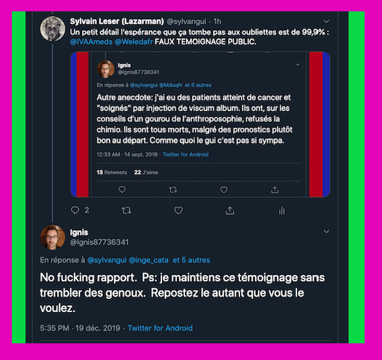 Pourquoi jây mets de la violence ? Il est inadmissible en 2020 de continuer de tenir ou de relayer des propos rĂ©visionnistes et ce, avec un plaisir provocateur non dissimulĂ©, dans ses nombreux tweets. Steiner Ă©tait un pacifiste, humaniste, gauchiste et considĂ©rĂ© par Hitler lui mĂȘme comme un ami des juifs. On connait la suite et je ne formule pas cela Ă la sauce des collabos se justifiant aprĂšs Vichy. Les collabos et les nĂ©o fascistes dâailleurs sont prĂ©sents dans la sphĂšre de Perra. Il y a des revisionnistes nĂ©gationnistes actifs dans toute la bande de la ZĂ©tĂ©tique. Ses principaux soutiens. Alors, nous causer de lâextrĂȘme droite, câest carrĂ©ment et Ă nouveau de lâinversion et câest bien sa pĂąte, ça ! Tout ce quâil reproche aux autres, pile poil câest toujours et inlassablement de lui quâil parle. Les jeunes Geeks, il semblerait, ne comprennent pas grand chose Ă cette histoire et sont mĂȘme prĂȘts Ă dire Ă©colo = nazi. Câest tirĂ© bien fort par les cheveux, heureusement pas tous⊠Si je parle de ça, câest ce qui mâa de suite sautĂ© au visage lorsquâil annonce un article sur la mĂ©decine pour en fait nous embrouiller dĂšs les premiĂšres lignes en crĂ©ant un faux contexte. Je vais pas tout reprendre Ă la lettre non plus, jâai pas que ça Ă foutre et jâai lâimpression de me rĂ©peter. Ce que je crois aujourdâhui câest quâil est vraiment malade mental, paranoĂŻaque et complĂštement mĂ©galomane, dâailleurs il le dit lui mĂȘme et signe des aveux. Cette pathologie est traitable mais incurable. Il nous parle mĂȘme dâavoir attrapĂ© ça, « la maladie de lâattouchement », Ă force de rendre visite Ă une de ses compagnes Ă lâHP ! Je dis : merde alors ce serait contagieux, nosocomial aussi ? On pourrait parler de transmission mais je ne vais pas entrer dans un discours psychanalytique quâil a lui mĂȘme rejettĂ©, cela semble Ă©vident. Sâest il allongĂ© avant de se retourner ? Je dirais quâil a fait une rĂ©sistance et a fuit la dĂ©marche de soins qui lui a Ă©tĂ© proposĂ©e par ses amis de lâĂ©poque, oĂč il gravitait autour du milieu anthroposophe. Je recommande Ă nouveau Ă ses « amis » de lâaccompagner vers la psychiatrie car il va forcĂ©ment sâenfoncer ou exploser en route. Jâen ai vu faire des graves dĂ©compensations suite Ă des auto-affichages de soi complĂ©tement contradictoires. Il sâest fabriquĂ© un monde de dĂ©mons, et de super hĂ©ros assez dĂ©bile dans lequel il aurait une place divine, la folie des grandeurs, gaffe Ă lâĂ©crasage. Il mĂ©lange ensuite des histoires occultes ou traditionnelles de Steiner et la mĂ©decine acadĂ©mique sans vraiment dâailleurs comprendre la mĂ©decine moderne, ses origines et la recherche. On lâa vu, il parle dâeffets terribles concernant les essais cliniques tĂ©rapeuthiques du Viscum, mais mon pauvre ami sans doute effrayĂ© par lâimage de la mort qui raisonne en permanence en toi : le corps mĂ©dical tout entier est plongĂ© exactement Ă cet endroit-lĂ en permanence, surtout avec les cancĂ©reux en phases finales et dommage pour ton invincibilitĂ©, elle va venir te chercher comme nous tous. Et la suite, bah un gars si au fait de lâimagination de lâau delĂ , tâen penses quoi ? Je comprends bien ta cavalcade et ta fuite en avant. Mais bon, tu peux aussi te rendre aux urgences les plus proches et demander Ă parler Ă un interne en psychiatrie, dĂšs ce soir tu seras pris en charge. Amen. Bon je dois aller bosser, je vais essayer de lire ce quâil a Ă©crit⊠Je lui suggĂšre ça car ses histoires de bruxisme pas digĂ©rĂ©es et sa connerie sans fin, et son envie de raconter des hisoires Ă la con sur des malades en baragouinant des trucs Ă effrayer des bonnes soeurs : On en a rien Ă foutre et tâinquiĂštes, le secret mĂ©dical concernant ta pathologie exacte, Ă part si tu le souhaites sera farouchement prĂ©servĂ© par le corps soignant. Alors ce procĂšs dâailleurs ? Tu as de la chance : la justice est mauvaise envers lâanthroposophie mĂ©dicale en gĂ©nĂ©rale et je pense quâil y aura relaxe et toi ? Mais rira bien qui âŠ