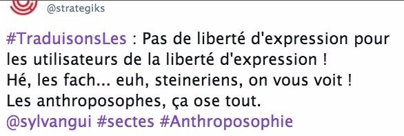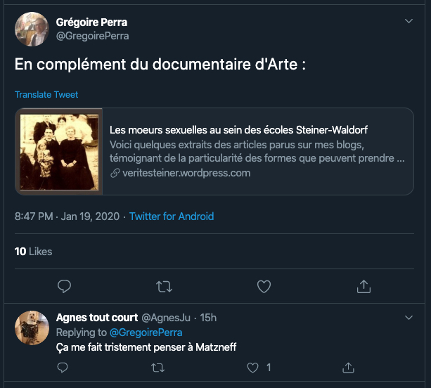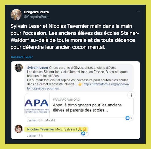 Mieux vaut ĂȘtre seul que mal accompagnĂ©. Lâanthroposophie a connu un paquet de dĂ©tracteurs depuis sa crĂ©ation, une personne disait quâon avait de la chance car Ă notre Ă©poque en France le leader principal anti-posophes nâĂ©tait quâun psychopathe « attoucheur dâadolescente ». Ce qui est dramatique câest que cela ne fait mĂȘme pas reculer la presse, qui le site allĂšgrement sans jamais faire vĂ©ritablement son travail dâenquĂȘte le concernant. On pourra dire que ce type a connu toutes les formes de dĂ©chĂ©ance y compris le succĂšs. Il est Ă prĂ©sent clair que son Ćuvre destructrice fait le jeu des grouillots de Big Pharma et de lâagrochimie, Bayer et Monsatan et je ne sais qui exactement. Cela doit ĂȘtre un phĂ©nomĂšne de mode, mĂȘme plus peur de lâexhibition de nâimporte quelle tĂąche Ă partir du moment oĂč cela fait vendre du papier et de lâaudimat. SacrĂ©e responsabilitĂ© que des journaleux et magouilleurs engagent avec entrain, sans scrupule. . Alors ce type continue de raconter Ă tour de bras que les Ă©coles Steiner sont des foyers de pĂ©dophiles, pourtant câest bien lui le seul Ă avoir Ă©tĂ© accusĂ© de fait similaire. Il tente Ă tout prix de faire passer les steineriens pour des racistes ayant Ă©tĂ© proches des nazis, alors que Steiner Ă©tait un gauchiste pacifiste dĂ©testĂ© par Hitler, mĂȘme mort. il re-tweete en permanence les propos nĂ©gationnistes et rĂ©visionnistes de ses amis, trĂšs fier de lui. Avec la montĂ©e de lâantisĂ©mitisme et lâignorance ambiante dâun terrible passĂ©, câest du ni vu ni connu. NâĂ©tant lui-mĂȘme quâun petit tripoteur, Il ne risque rien. Il nâĂ©prouve mĂȘme pas la honte, ni eux. Bravo les garsâŠ