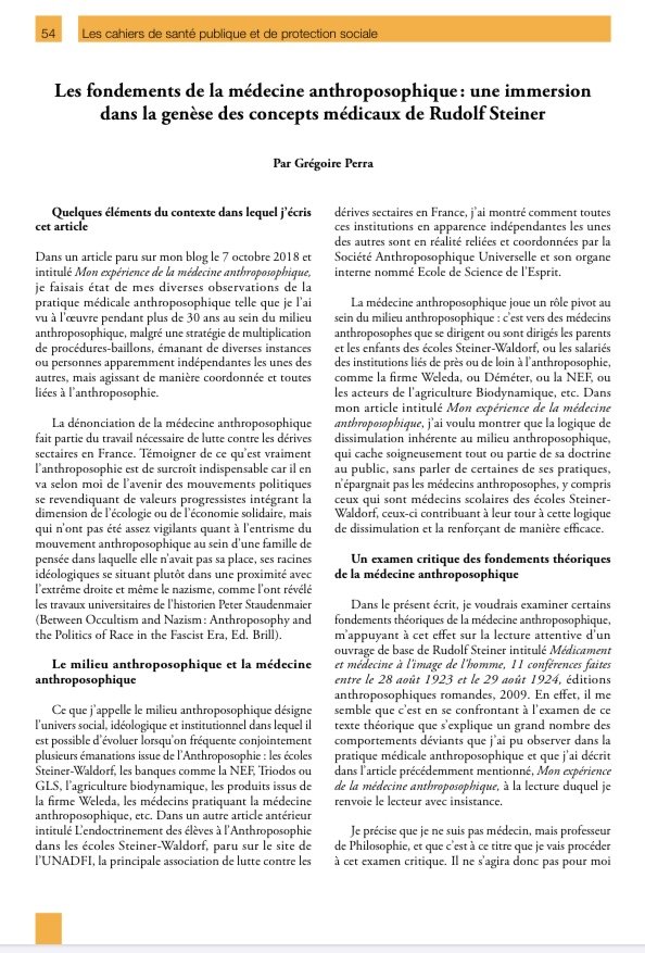 Si votre seule source sur Perra, c’est ce faux journaliste qui n’Ă©crit que pour des revues anthroposophes,cela me semble faible. Des sources bien plus sĂ©rieuses,reconnues,et sans conflit d’intĂȘrets critiquent l’anthroposophie et dĂ©livrent le mĂȘme message que GrĂ©goire Perra,et ce partout dans le monde. Vous comprendrez bien je l’espĂšre que face Ă la faiblesse de votre source je ne puis dĂ©cemment pas me faire un avis diffĂ©rent avec ses torchons.
