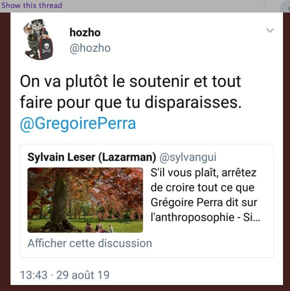 Mais ce qui est plus ou moins rigolo, c’est qu’il se prend pour je ne sais pas trop qui en fait il ne peut s’empĂȘcher de parler de lui Ă la troisiĂšme personne trĂšs rĂ©guliĂšrement, le blog ici prĂ©sent regorge de captures d’Ă©cran lĂ -dessus, cela pourrait ĂȘtre juste touchant mais il ne faut pas oublier qu’il souffre aussi d’Ă©normĂ©ment de mĂ©chancetĂ© Ă l’Ă©gard du courant anthroposophique et des gens en particulier. Ce n’est juste de la petite nĂ©vrose on dirait, y a du gros pathos. Et je maintiens que ses copains devraient plutĂŽt l’aider que de lui donner de l’Ă©lan. J’en ai vu exploser en route Ă force de contradictions…