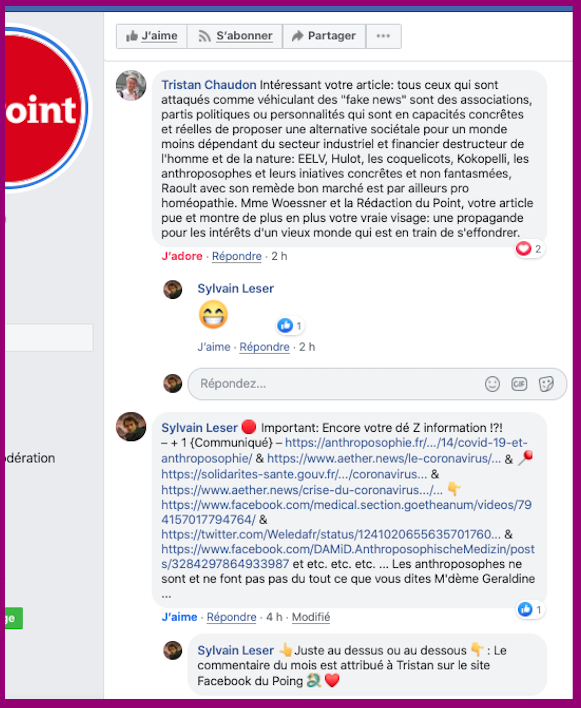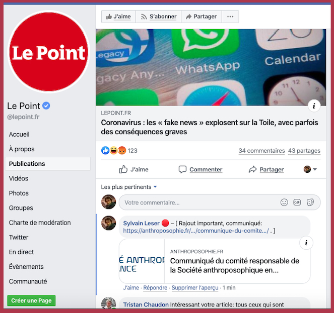 [Hors du sujet Anthroposophie, mais mĂȘmes dĂ©tracteurs] – Et chez les vraies* sceptique qui allaient commencer Ă argumenter les sujets abordĂ©s : Oui oui il y a une vĂ©ritable communautĂ© de vraies* rationaliste sceptique qui luttent contre la zĂ©tĂ©tique infiltrĂ©e actuelle et son panier de crabe d’astroturfeur$ qui ne font que de la dĂ©sinformation massive. (c’est trĂšs complexe). Je vous tiendrais au courant si il y a des avancĂ©es de ce cotĂ© lĂ … Voici en attendant un lien vers un mauvais dĂ©bounquage: https://www.cbc.ca/news/technology/fact-check-viral-video-coronavirus-1.5506595?fbclid=IwAR2UXlM2W9Y28tXeAiB68tS7yWE_mk9n-MS2JVNbKjXeCHuz_NCarKzTAco. Sinon venez voir e par vous mĂȘmes chez les bons: https://www.facebook.com/groups/pseudo.scepticisme/.