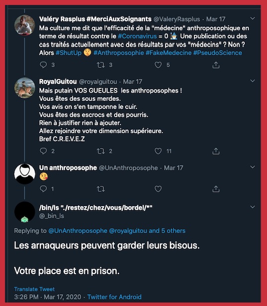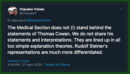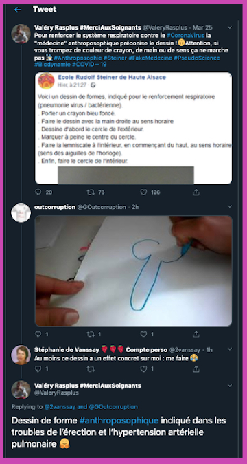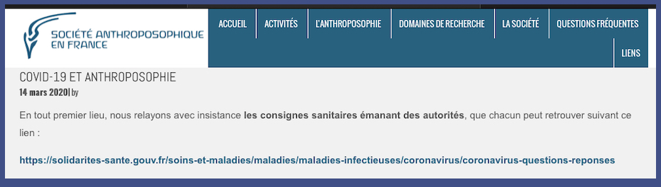 â + 1 {CommuniquĂ©} â https://anthroposophie.fr/2020/03/14/covid-19-et-anthroposophie/ & https://www.aether.news/le-coronavirus/?fbclid=IwAR2j8kf8KruX0PBvYW15sX54Ag3iuLwBaGodjNVdxYP-qRZYK5QsB9iOmDE & đ https://solidarites-sante.gouv.fr/soins-et-maladies/maladies/maladies-infectieuses/coronavirus/coronavirus-questions-reponses & https://www.aether.news/crise-du-coronavirus-construire-une-immunite-par-une-stratification-du-risque/?fbclid=IwAR3bEFsorrCEthFIXq8bKrIzgq8gJbBSikUrKxPB2mUwpeJEt2Itevzd3SQ đ https://www.facebook.com/medical.section.goetheanum/videos/794157017794764/ & https://twitter.com/Weledafr/status/1241020655635701760?ref_src=twsrc%5Etfw%7Ctwcamp%5Etweetembed%7Ctwterm%5E1241020655635701760&ref_url=https%3A%2F%2Flamehumaine.com%2F2020%2F03%2F25%2Fcharlie-la-fait-express%2F & https://www.facebook.com/DAMiD.AnthroposophischeMedizin/posts/3284297864933987 et etc. etc. etc. … Les anthroposophes ne sont et ne font pas pas du tout ce que vous dites M’dĂšme Geraldine …