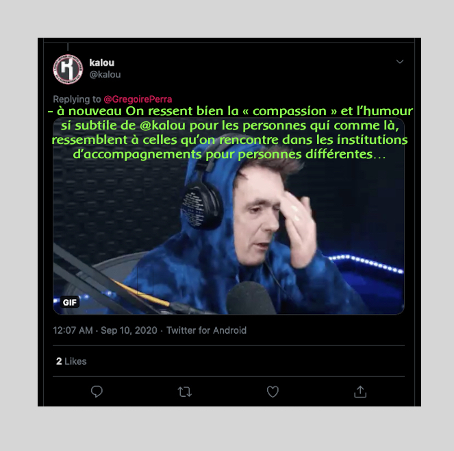 1 https://twitter.com/kalou/status/1304140635595829251?s=202 https://twitter.com/kalou/status/1303817233785917441?s=20 3 https://twitter.com/SylvainFreres/status/1323832539979632641?s=20