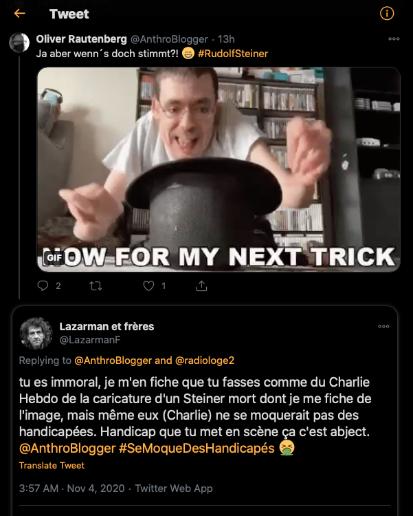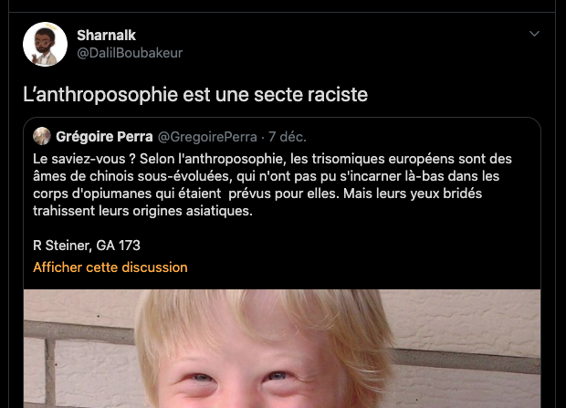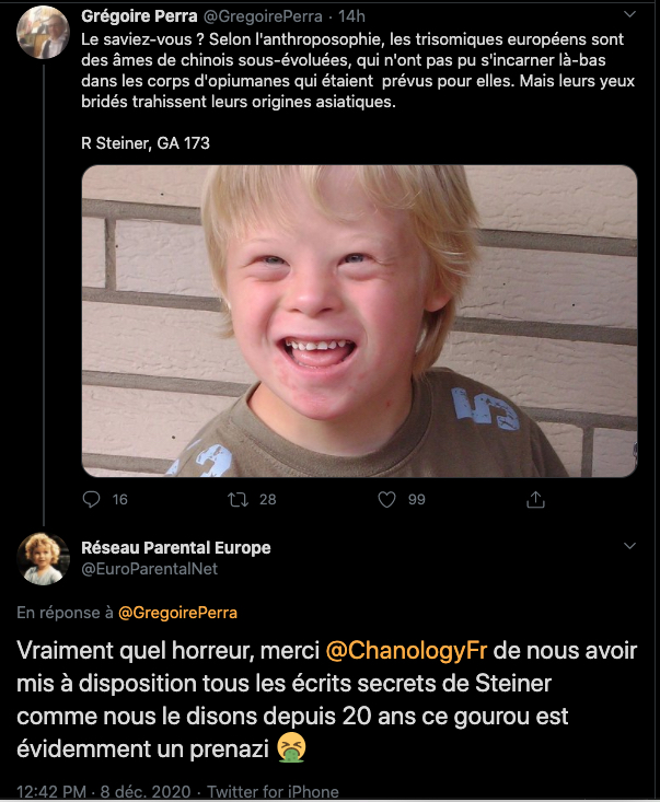 đComme tous les jours… Une attaque… sur Twitter et sur Facebook-toujours plus calme): đhttps://www.facebook.com/SlateFrance/posts/10158522885556233 â LĂ c’est Slate.truc et deux chefs de files des NoFaktrucs… http://www.slate.fr/story/196546/pedagogie-steiner-anthroposophie-dangereuse-enfants-autisme-mouvement-camphill G. Perra est largement citĂ© il n’a mĂȘme plus Ă lever le petit doigt, il jubile… Alors ça tourne sur Twitter, et comme d’hab’ cela aura un impact. j’ai du faire 200 tweets (500 Ă prĂ©sent), pour poser les deux seules Ă©lĂ©ments contradictoires du moment et je tricote, il va y en a voir pour 24h… https://marcherparlerpenser.wordpress.com/2020/04/15/education-tendances-evolutives-et-destins-denfants-12-lautisme-ou-linvitation-a-re-humaniser-nos-societes/ https://lamehumaine.com/2019/12/12/la-rose-blanche/ _____________________________