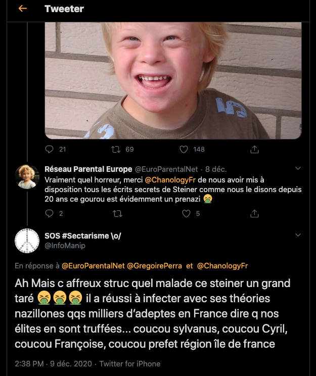 InquiĂ©tantes prises en charge de patients autistes je trouve cela trĂšs trĂšs grave dâoser dire cela et dâavoir diffusĂ© cela. Je serais anthroposophe et dans une des structures: je ferai tout pour engager des poursuites judiciaires, câest honteux. Il y a des mĂ©decins psychiatres et des psychologues dans tous ces centres, Ă©videmment. â