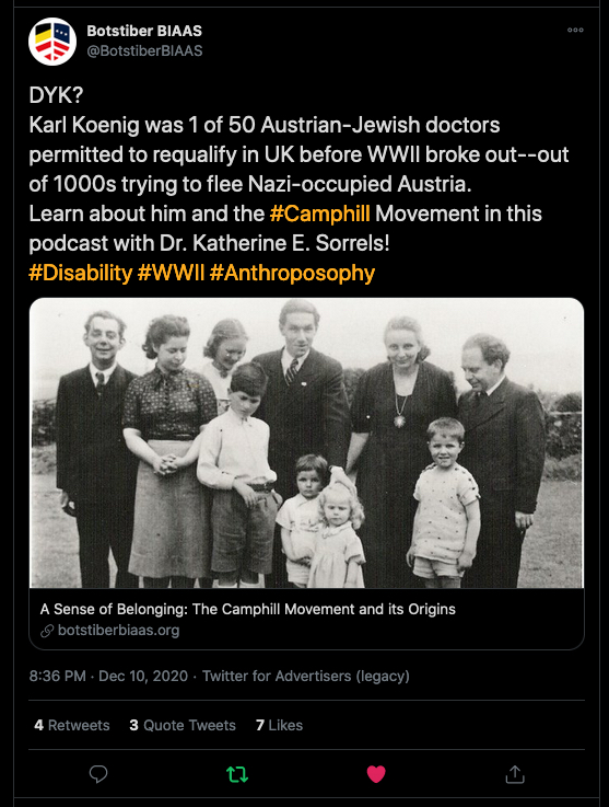 RĂ©fugiĂ©s de l’oppression nazie en Autriche, le groupe du Dr König comprenait des mĂ©decins, des Ă©tudiants en mĂ©decine et des jeunes crĂ©atifs qui s’Ă©taient rĂ©unis dans la Vienne d’avant-guerre pour explorer l’anthroposophie. AprĂšs avoir fui l’Autriche, le groupe s’est rĂ©uni en 1939 Ă Kirkton House, prĂšs d’Aberdeen, pour commencer Ă mettre en pratique leurs idĂ©es pour un nouveau type de vie. Les deux premiers enfants handicapĂ©s les ont rejoints en mai.