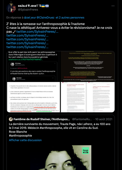 _Guide dâĂ©tude de lâ#anthroposophie enIsraĂ«l Ce guide rassemble pour la premiĂšre fois la variĂ©tĂ© des formations opĂ©rant dans notre pays dans les diffĂ©rentes filiĂšres : enseignement #Steiner_Waldorf, biodynamie, thĂ©rapies & conseils, eurithymie, art : https://twitter.com/SylvainFreres/status/1631452567896039426?s=20 & Lâ1 des accusations des nazis contre lâanthroposophie et Steiner Ă©tait quâils Ă©taient « juifs », et en effet, la part des Juifs parmi les anthroposophes dans lâAllemagne dâavant-guerre Ă©tait bien supĂ©rieure Ă leur part relative dans la population gĂ©nĂ©rale. https://lamehumaine.com/2020/07/13/rudolf-steiner-en-terre-sainte/ https://twitter.com/SylvainFreres/status/1631453385596583939?s=20 â #anthroposophie et judaisme https://twitter.com/SylvainFreres/status/1623571264181862400?s=20