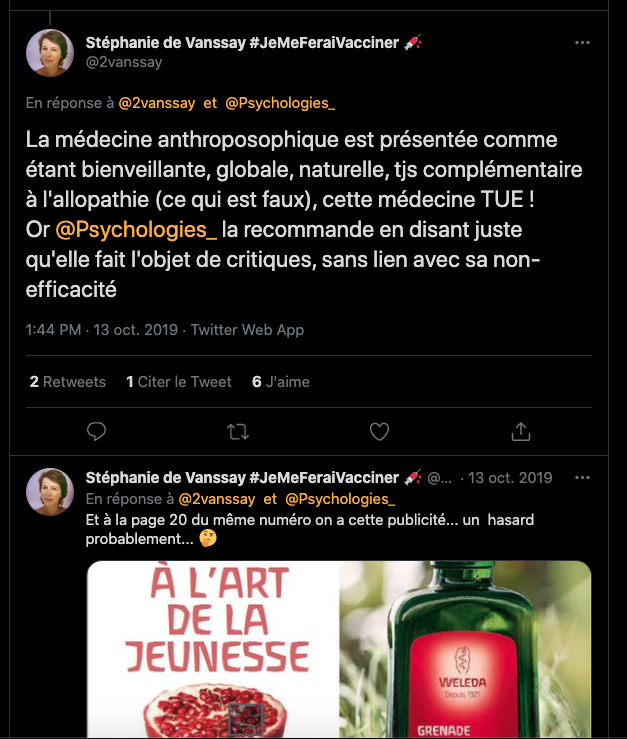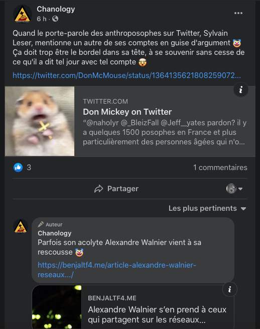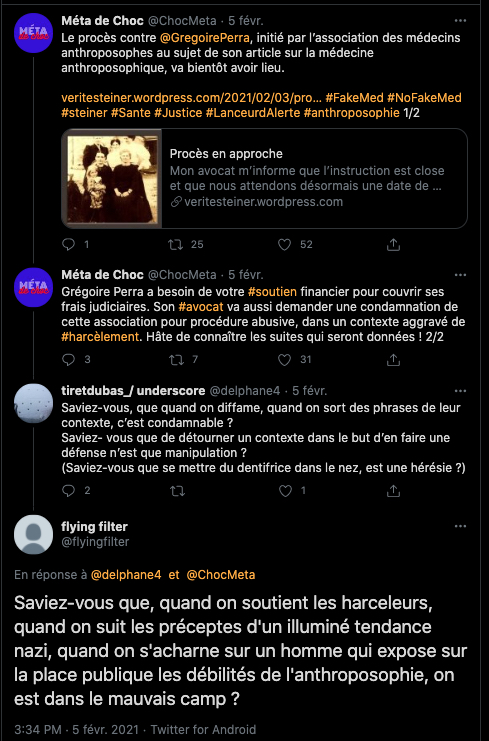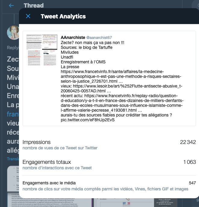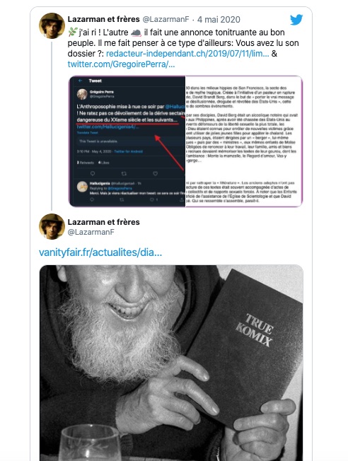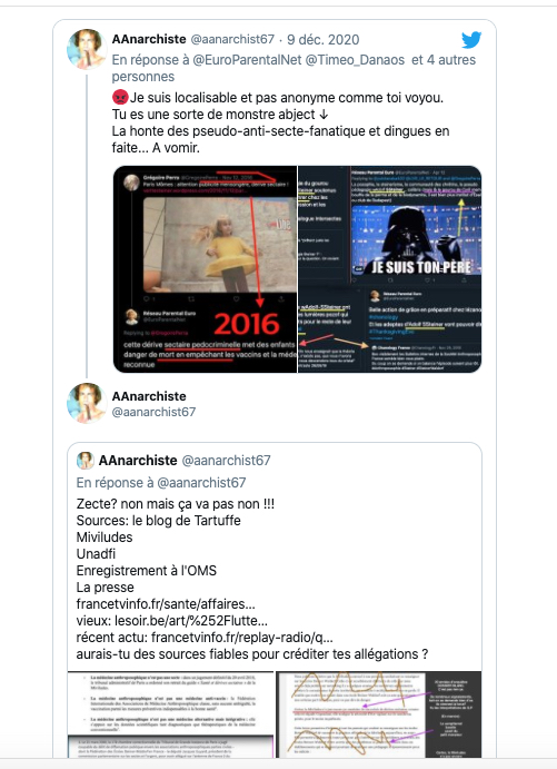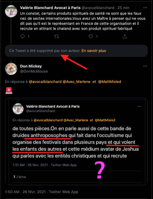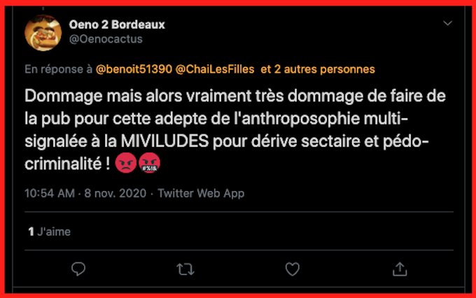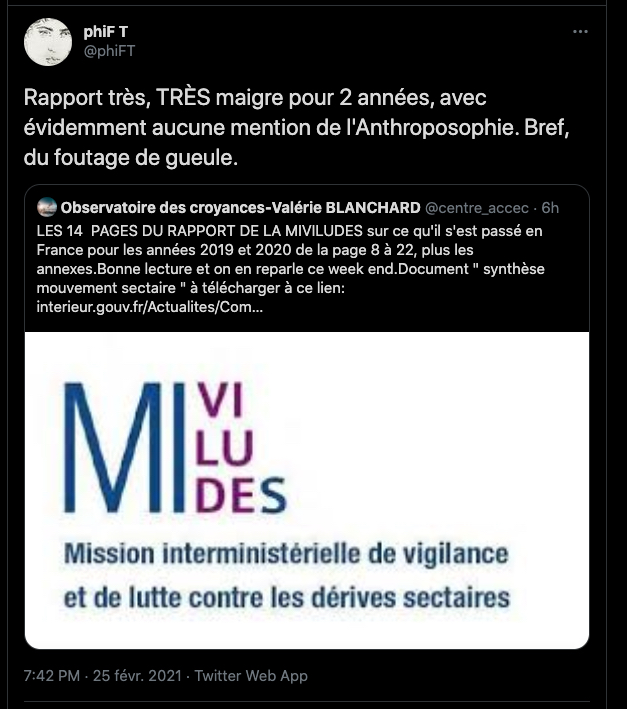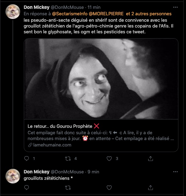 Le petit cercle sous le tweet de Crado s’étoffe, ces personnes sont proches des milieux anti-secte. C’est la honte complète en fait, pour ces associations et lorsque l’état via quelques pointures habituelles parlent des assocs de lutte AS, il est bien de vérifier si ces personnes ne sont pas des radicalisés fanatiques de premier ordre, qui ont perdu e s pieds, ceux que je vois sur le réseau semblent être irrécupérables comme la Connasse là ⇣, mais il n’y a pas qu’elle, le cercle d’habitué e s est vraiment famélique et la Miviludes ne devrait pas être fier d’avoir bossé avec eux.
