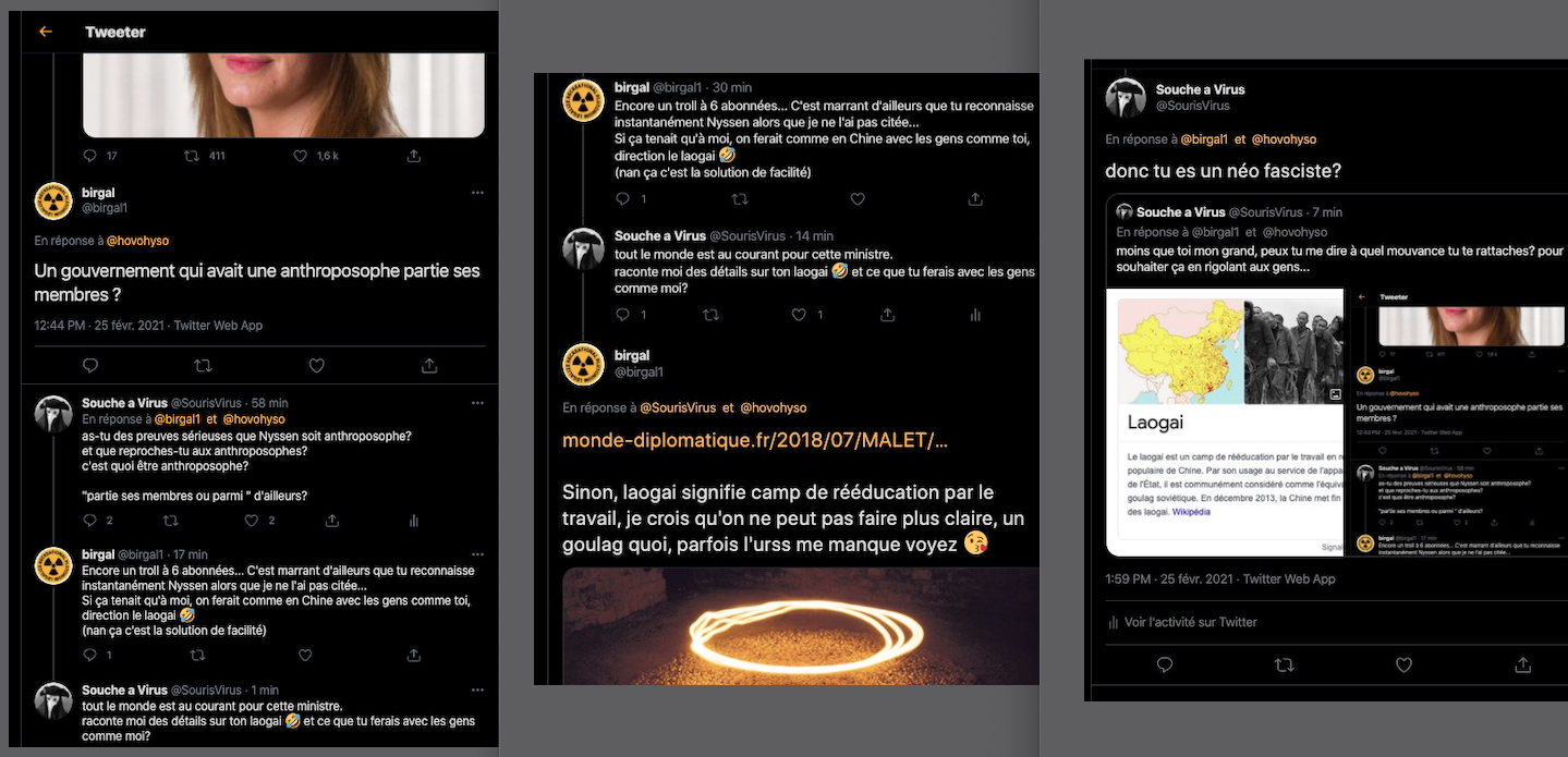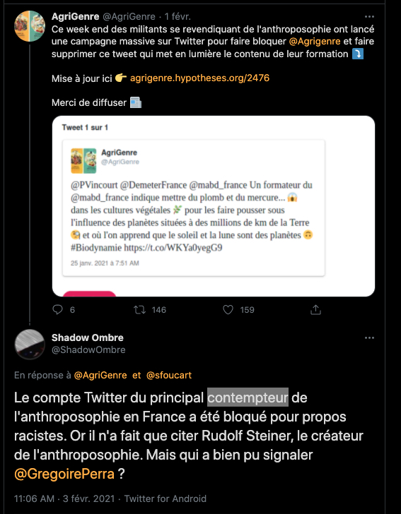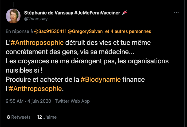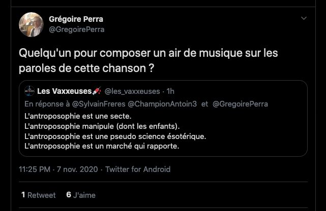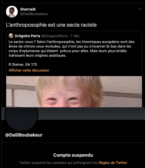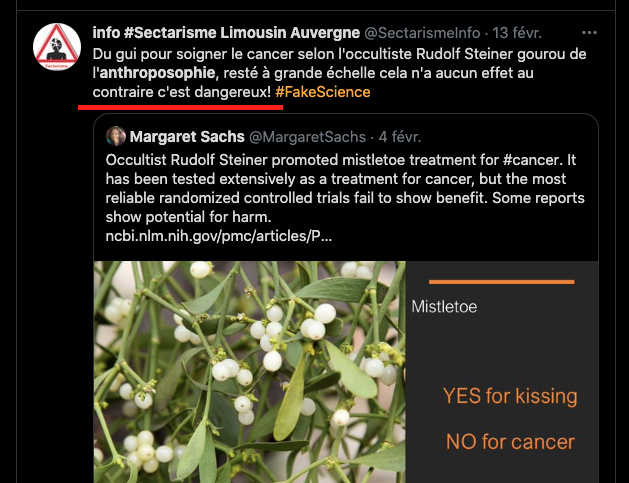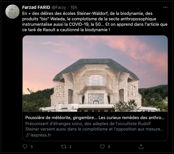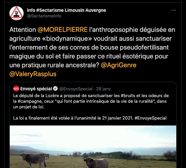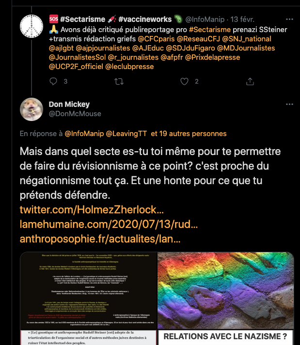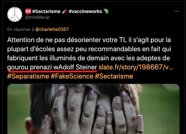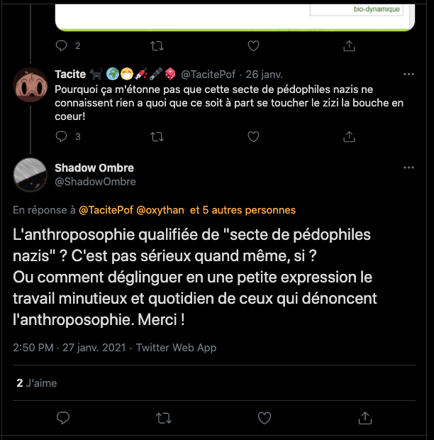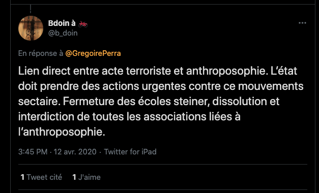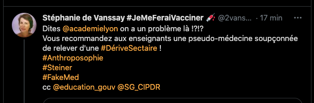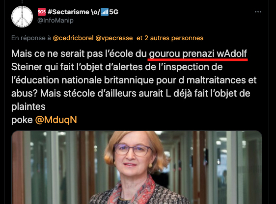 Un peu de sérieux svp, la ministre à fait une déclaration concernant les sectes et n’a pas mentionné e l’anthroposophie, les types sont ultra pas content et veulent absolument y inclure les posophes, Twitter s’excite depuis 24h et là un facho Z, Ze, Zet de première veut m’envoyer dans un camp chinois de rééducation par le travail… Sympa, non?