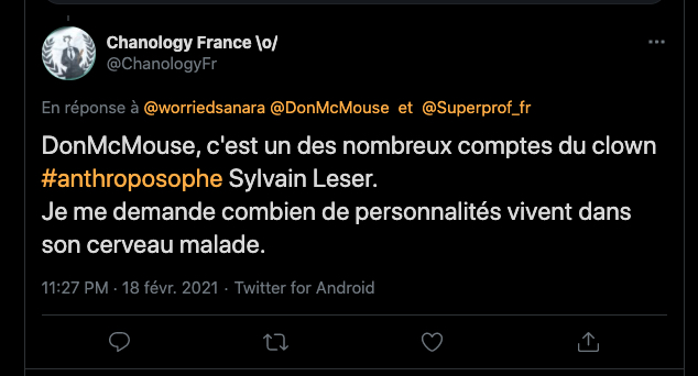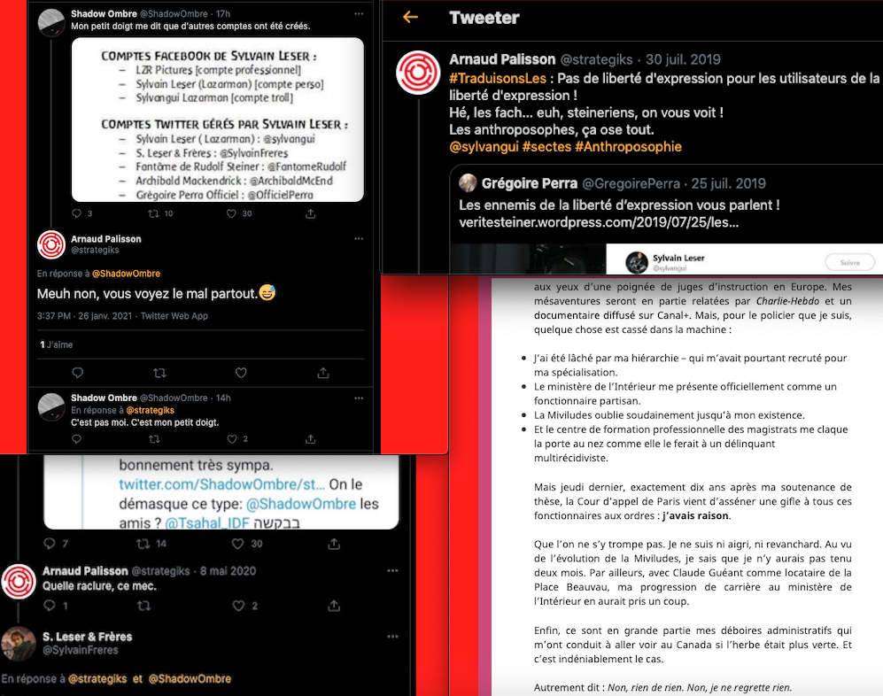 Arnaud P, déchu des RG dont la carrière c’est soldé à mettre à jour des trucs que tout le monde savait 10 ans après sur la scientologie , il le dit lui même sur son blog qui parait honnête , mais ses Tweets révèlent de la bêtise sans nom : » ➡️J’ai été lâché par ma hiérarchie – qui m’avait pourtant recruté pour ma spécialisation.