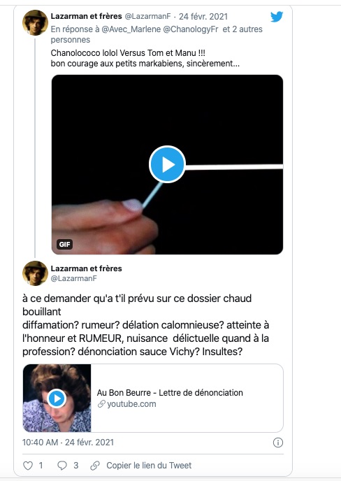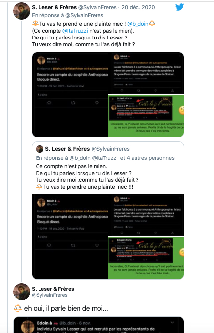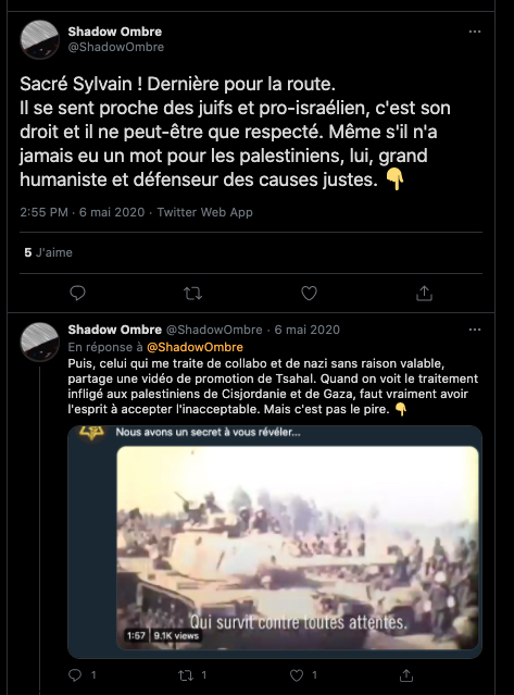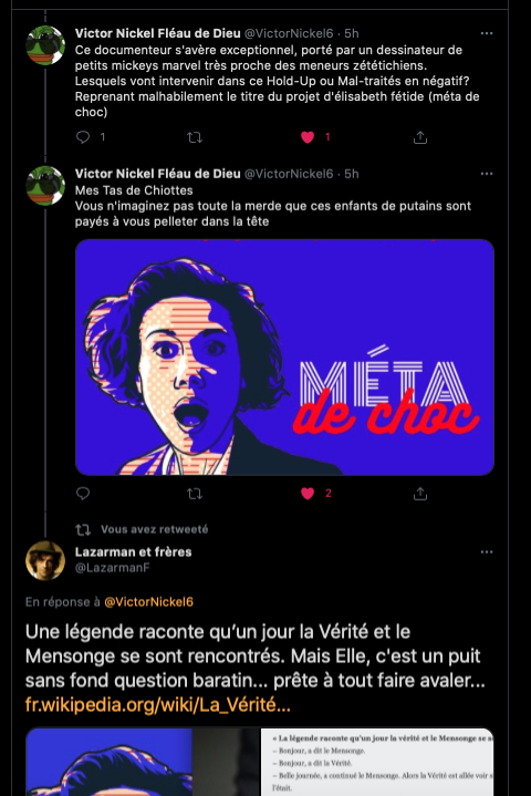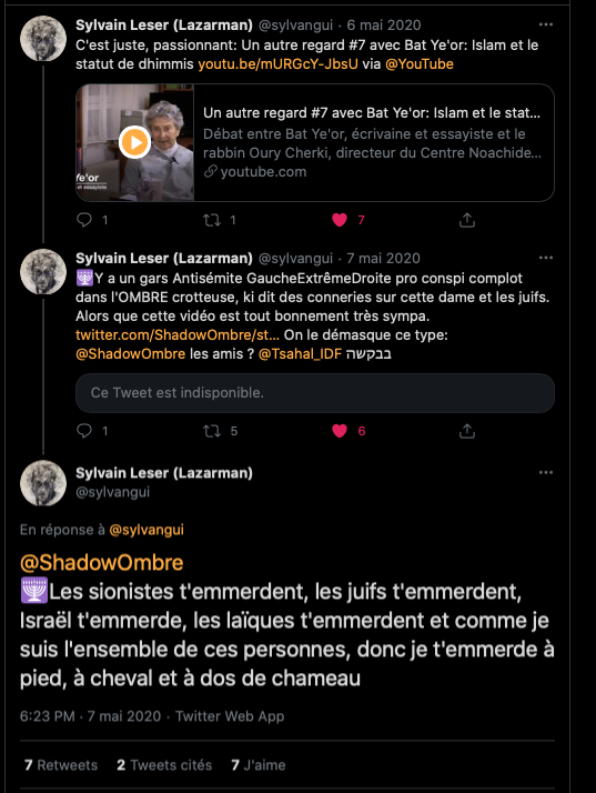 très sympa, j’apprends que ses propos détournés ont été repris par l’Xdroite juive en France, mais cette vidéo à caractère historique et biblique il ne me semble pas, surtout la fin que je vous invite à l’écouter et à en juger par vous même avant tout. Mais crado expert en conspicomplotisme mensonges et embrouilles s’est permis de me faire un sketch en public là dessus, ce sinistre imbécile anonyme. Voici quelques vieux débounquages sauce twitter le concernant: https://twitter.com/sylvangui/status/1258432367179546625?s=20 & https://twitter.com/ArchibaldMcEnd/status/1266624572859863040?s=20 é https://twitter.com/LazarmanF/status/1256915382113308677?s=20 & https://twitter.com/LazarmanF/status/1258784962695901189?s=20 & https://twitter.com/LazarmanF/status/1277839681883955200?s=20 é https://twitter.com/LazarmanF/status/1290736404222357508?s=20 & https://twitter.com/LazarmanF/status/1295309714541207557?s=20 é https://twitter.com/SylvainFreres/status/1346815733909647363?s=20 & https://twitter.com/SourisVirus/status/1347058371728388096?s=20 é https://twitter.com/SylvainFreres/status/1335900835637760000?s=20 &