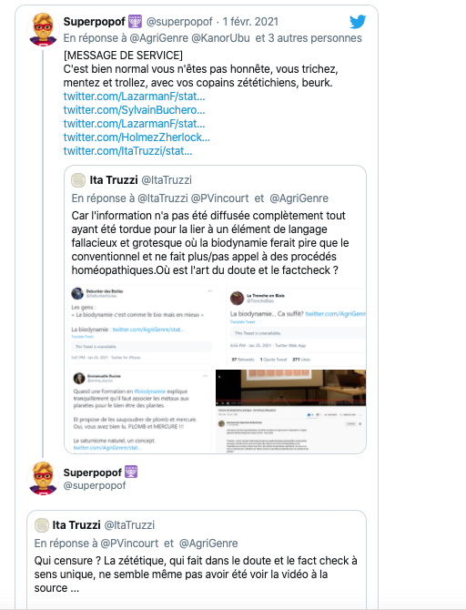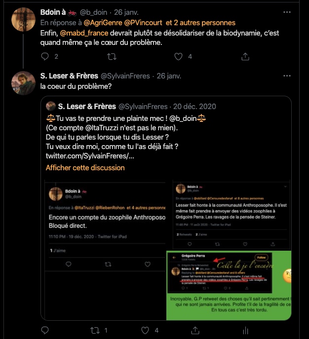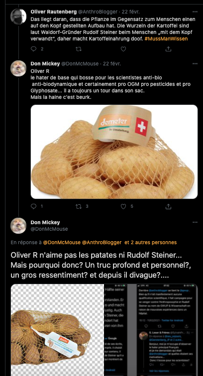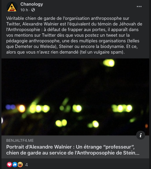 j’ai hâte que Bruno Blum : https://www.facebook.com/brunoblum/posts/10159206327083223 en sache plus sur qui tu es derrière ta façade de bon écolo gauchiste mais qui en fait tapine à l’année pour les types de la zététique X Alt Right, de l’agro pétrochimie écocidaire pro-ogm pro-pesticides et surtout surtout anti-bio et sans scrupules, les cartels les plus criminels qui soient …. Tu es un anti posophe de taille à présent, à dire des choses abjectes, fausses folles et monstrueuses…. Tu sais bien que je ne suis pas le seul à t’avoir repéré hein, et que le dossier sur toi s’épaissit de tous bords….. ce que je n’ai pas supporté, ce sont tes attaques traitant Steiner, et la biodynamie d’antisémite et de raciste… moi qui ai appris tout ça en Israël pendant 5 ans où il y a 10 fois plus d’anthroposophes qu’en France et je connais bien les autres pays de la région avec 700 fermes biodynamiques en Egypte etc. et toi qui ment car tous les dossiers, je te les ai montrés 100 fois et tu continues de mentir, c’est que t’es pas clair et pas ce que tu prétends être. Quelques exemples non-exhaustifs: