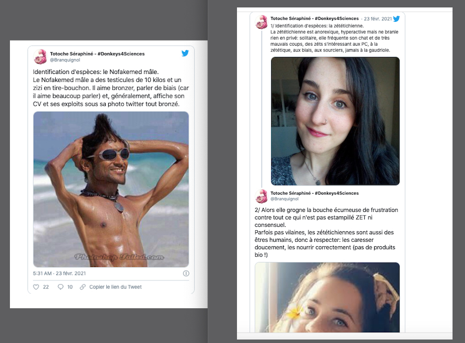 3/ Identification d’espèces: le Nofakemed mâle. Le Nofakemed mâle a des testicules de 10 kilos et un zizi en tire-bouchon. Il aime bronzer, parler de biais (car il aime beaucoup parler) et, généralement, affiche son CV et ses exploits sous sa photo twitter tout bronzé. https://twitter.com/Branquignol/status/1364082783996510208?s=20 & https://twitter.com/Branquignol/status/1364070321997889537?s=20