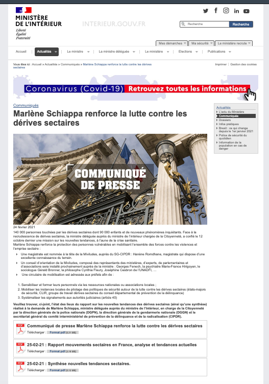 Depuis 20 ans, la Miviludes n’a pas relevé de cas avéré de dérive sectaire et le précédent rapport parlementaire est un dossier BLANC.