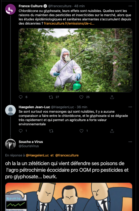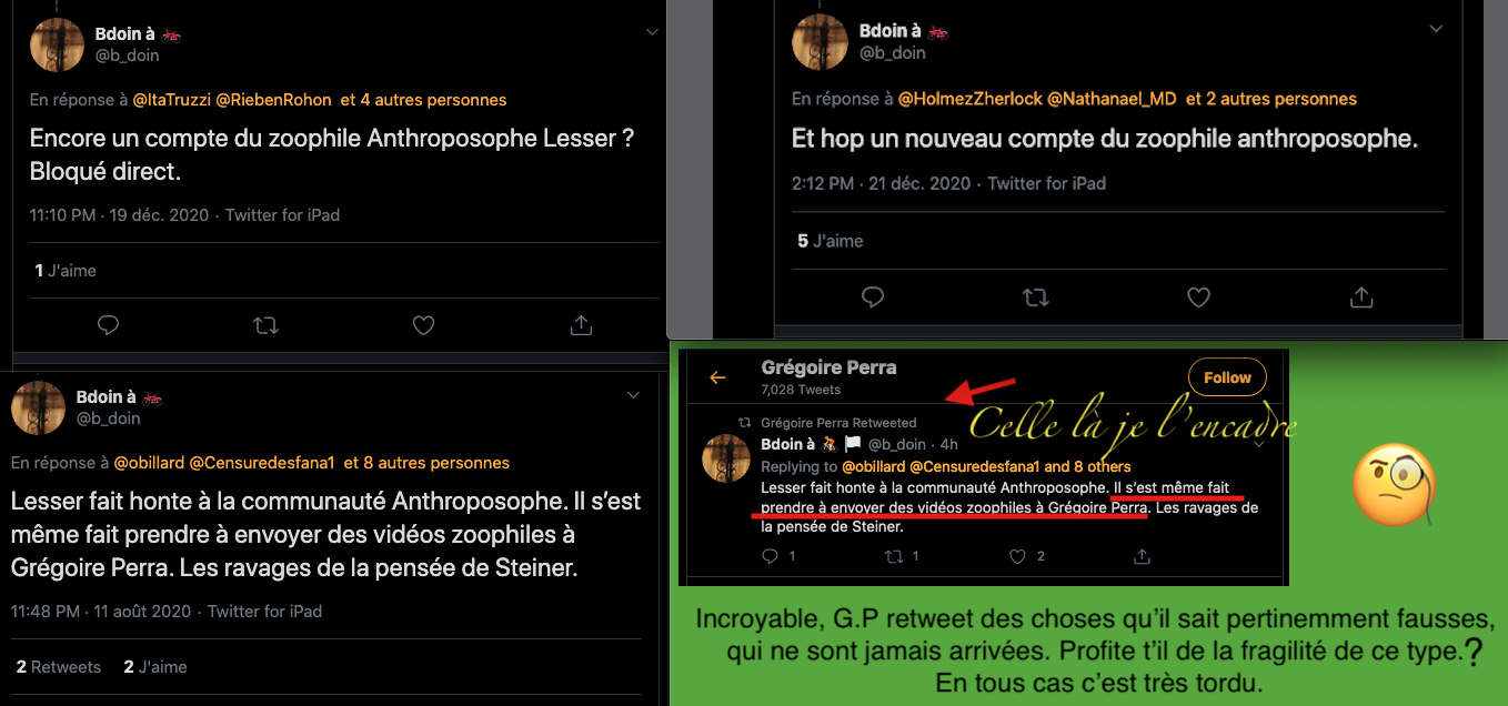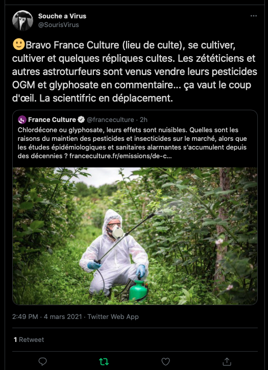 Le gars est endoctriné profond dans la zététique des zététichiens, Z, Ze, Zet les techno fascistes grouillots des cartels industriels. En ce moment il fait des listes sauce collabo me concernant. Le gars se présente comme un gaucho mais tapine sévère pour l’agro pétrochimie écocidaire… Un bruit court qu’il aurait été recruté en amont mais faute de preuves autre que la logique, regardons plutôt sa conduite sur le web actuellement. Je lui ai longuement parlé au début, respectant l’artiste qui sommeille en lui mais rien à faire malgré les centaines de liens: il a continué de mal en pis et baigne dans son milieu conspicomplot Z haineux et mensonger, à troller comme un trollo. En est-il conscient? Je crois que oui…