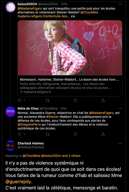 Les endroits ou cela ressort : https://www.facebook.com/lefigaro/posts/10158464667016339 & https://www.facebook.com/MadameFigaro/posts/10158856456753744 Vous verrez la même bande que d’habitude, la haine est au beau fixe et tapez ça dans la barre de recherche Twitter, vous verrez les surprises : Montessori, Hattemer, Steiner-Waldorf… Le boom des écoles hors contrat.