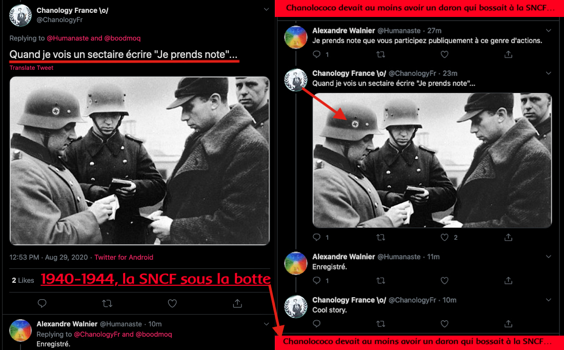 c’est la haine et l’incitation à la haine en direct. Les termes « sectes », « sectaires » fusent à tout va, en direct : vous êtes traité(s) de « SS » ou de « nazi homophobe, dangereux et raciste »… Je dispose de tout une collection de captures d’écran à vous montrer si besoin (il y en a déjà plein sur ces modestes pages de blog que je préfère nommer « empilage » plutôt qu’ « article ». En effet, tout va très vite sur les réseaux et je n’ai pas vraiment le temps de construire, juste celui d’archiver.