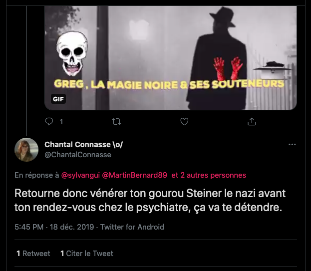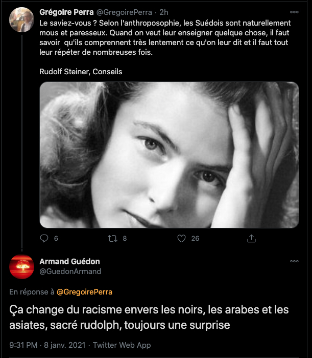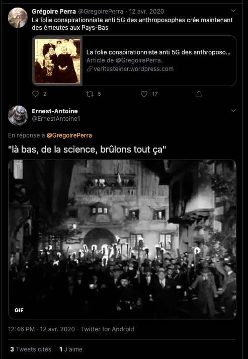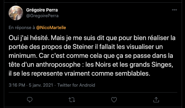 https://twitter.com/GregoirePerra/status/1343621388813414401?s=20 & https://twitter.com/GregoirePerra/status/1343282434499096576?s=20 & https://twitter.com/GregoirePerra/status/1343281800362287105?s=20 & https://twitter.com/GregoirePerra/status/1342170210988683265?s=20 & https://twitter.com/GregoirePerra/status/1341813580862251009?s=20 & https://twitter.com/b_doin/status/1341008661401972736?s=20 & https://twitter.com/GregoirePerra/status/1340917024596365312?s=20 & Perra sait donc et dit en quoi les anthroposophes croient. Ce type mérite définitivement la légion d’honneur, comme certains de ses adeptes lui ont écrit sur Twitter… lolol.