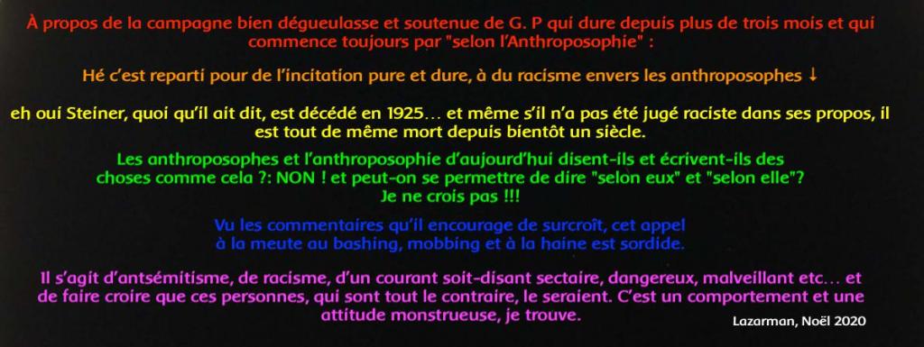 G. P vous a fait une nouvelle page sur son blog lolol, avec une compile à la con. Ça fait 10 ans ou plus qu’il est dessus, comme un fada fort pugnace. Il est donc conforme à la vérité de dire que c’est un falsificateur et un imposteur, qui tente de vous faire détester Rudolf Steiner pour de mauvaises raisons, en trichant. Mais surtout les anthroposophes d’aujourd’hui. La bonne question est de vous demander pourquoi fait-il tout ça ? n’y aurait-il pas un problème très personnel derrière ses prêches obsessionnelles et répétitives ? car, à ce jour rien de neuf. Il a été viré et vous savez tous le pourquoi du comment.