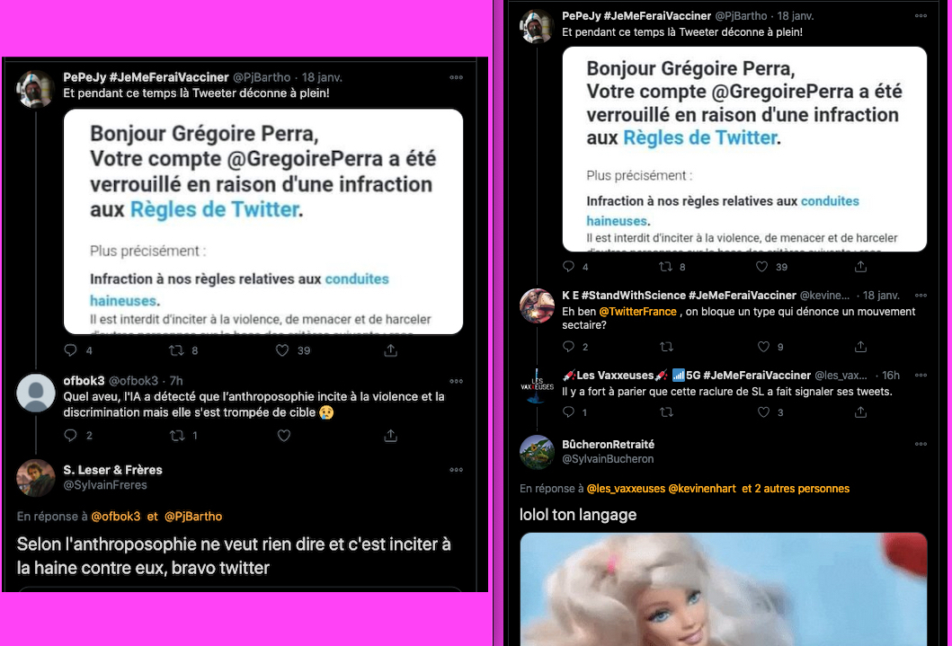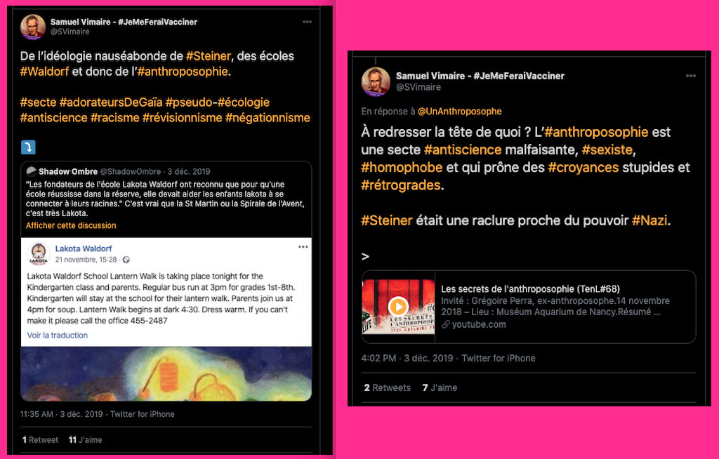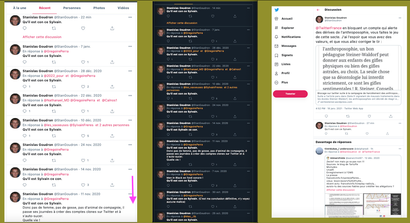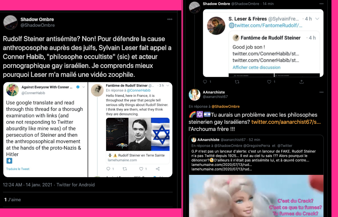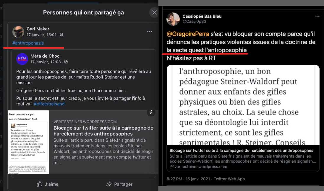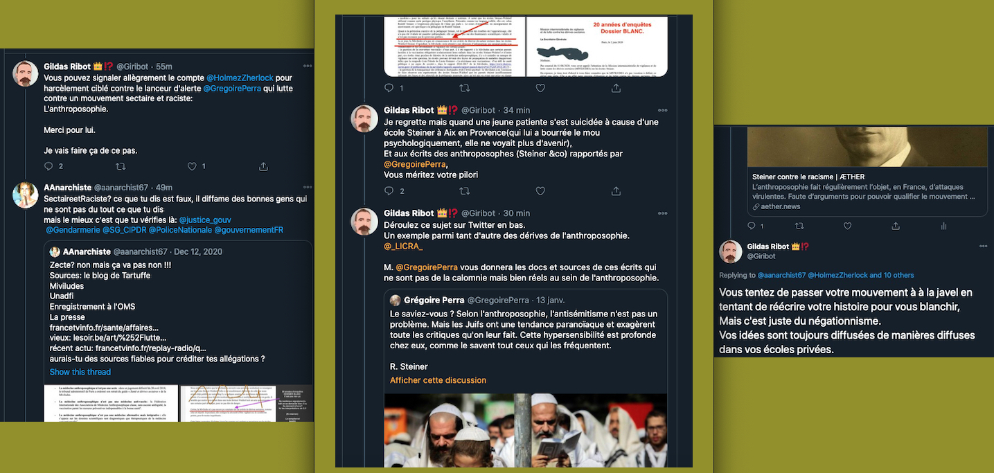 Incroyable, le mec signe et rempile qu’en plus les pédagogues seraient censés mettre des mandales aux élèves, on est en 2021… Pour Kalou sa ou son complice: je cite: « le compte de l’alerteur G.P est restreint parce qu’il informe et transmet des sources historiques afin de dénoncer le caractère antisémite et raciste d’un courant religieux à dérives sectaires. Pourriez-vous svp mettre un humain sur ce problème. » etc… je vais coller les perles ci dessous en commentaire de cette capture d’écran⬇︎et pour Crado il est normal de faire croire que Steiner aurait été antisémite (ce qui est faux). Mais là on s’aperçoit bien et à nouveau que la seule et unique chose qui compte pour eux toutes et tous: c’est la RUMEUR… Ils ne sont pas la pour apprendre ou comprendre, mais pour basher, troller, salir, vaumire, mentir, insulter et tenter de détruire par la diffamation et la calomnie…