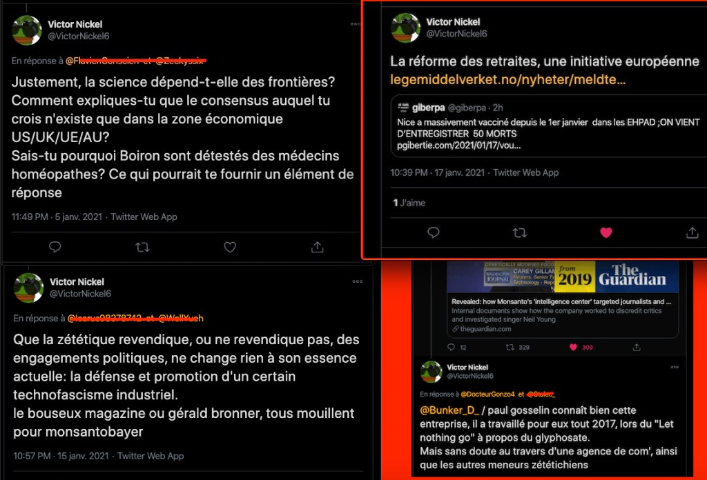 Ce qui suit semble hors sujet, certes, mais c’est la même bande que l’on retrouve sur quasiment tous les dossiers, les Z, Ze, Zet de l’astroturfing sont des multicartes, et une poignée sont au service de G. P : l’idiot utile des ‘chef de file’ grouillots des lobbys et des cartels industriels (criminels) à qui ils ont prêté des fans, des suiveurs, des commentateurs. Ils lui font vivre ses déclarations et ses rumeurs… La crise Covid les révèle $ plus que d’habitude…