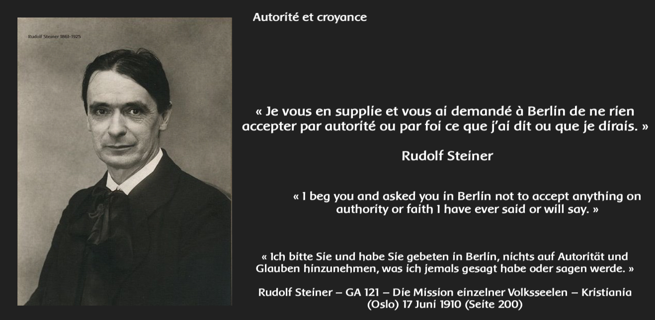 Concernant les anthroposophes, je ne dis pas que, dans le « lot », il y a forcément quelques idiots fans de Dieudonné, de racistes antisémites, d’homophobes ou quoi ou qu’est-ce … il y a sans doute même des gens qui sont penchés trop à droite. Mais, cependant, il y a quasiment zéro esprit communautaire dans cette branche philosophique d’érudits. « Être anthroposophe » ne veut d’ailleurs pas dire grand chose, Steiner a invité ses suiveurs de l’époque à se rapprocher des sciences et de vérifier les choses par eux-mêmes ; il a insisté sur l’individualité éthique et à la liberté de penser lors de ses 6700 conférences.