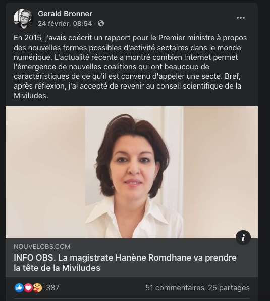 Gerald Bronner, l’intellectuel préféré des industriels comme dirait Reopen999 et qui a porté plainte contre « Les Gardiens de La Raison » va se retrouver au conseil scientifique de la Miviludes. Et comme il le dit, donner un coup de main à l’Afis… Bon bah je pense que cela dessert cette entité, car les accointances entre l’Afis et les industriels pro Glyphosate, pro OGM et pro pesticides commencent à être rudement connues.