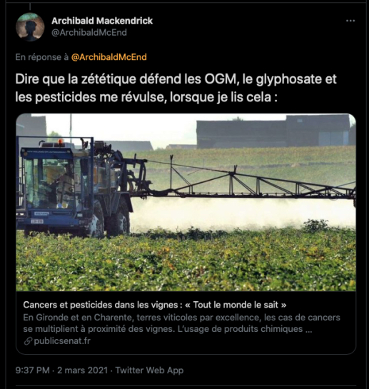 Fin de semaine calme, les zététichiens doivent être en train de préparer un mauvais coup, ils ne sont pas vraiment venu défendre leur Glyphosate, pesticides et OGM sur Twitter, le téléfilm INTRAITABLE et l’opinion public était sans doute trop forte à leur goût. Sinon c’est la troisième fois que GP tente de faire retirer son nom de la pétition, mais bon sa motivation est idiote contre ma liberté d’expression, il est un personnage public, comme il l’a sans doute toujours souhaité: être au centre de l’anthroposophie. Si le gars souhaite maîtriser son image public c’est pas gagné et de surcroît impossible, comme stipule l’effet Barbara: essaye encore…