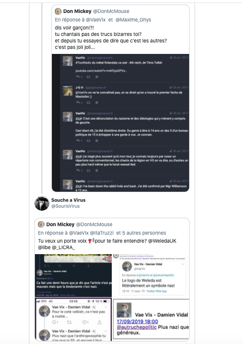 Je reste à ma place en tant que simple témoin de ce qui se passe sous mon nez sur Twitter où ces personnes des petites associations insultent gravement, font de la rumeur, de la calomnie de la diffamation, de la petite truanderie genre mini hacking à la petite semaine, du doxxing, des délits très minables en fin de compte, etc. Des menaces avérées en passant par de la délation et de la dénonciation basées sur de fausses informations. Ils traitent aussi les gens de nazis, de ss, d’homophobes antisémites et de racistes, de types dangereux pour ceci ou cela et l’expriment avec virulence. Tout ce qui peut réveiller de l’émotionnel du public en fait