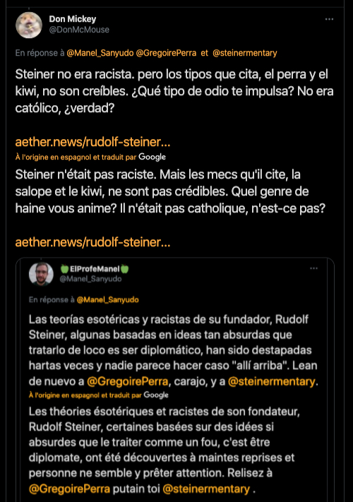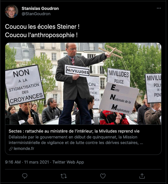 Le type que tout le monde connaît et qui a pour intention de faire fermer les écoles Steiner et de nuire à l’anthroposophie dans tous ses domaines : biodynamie, médecine intégrative, accompagnement de personnes dites différentes ou ayant des besoins spéciaux (les handicapés mentaux), art thérapie, etc. -et sans doute d’interdire, à terme, les livres de Steiner qui, pour lui, est une « littérature qui rendrait fou ».