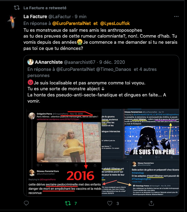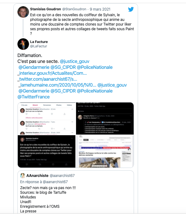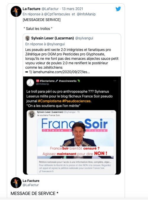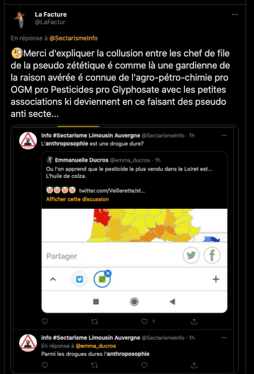 Comme vous pouvez le constater il y a collusion entre la zététique 2.0 ,(connue pour ses accointances avec l’agro pétrochimie qui défend les OGM, les pesticides et le glyphosate et aussi les histoires grospharma, c’est les mêmes chef de file aux commandes (et les mêmes comptes twitter à l’action), d’ou l’attribution du terme astroturfing, de bashing, de mobbing) avec les, que j’appelle: pseudo-anti-secte, du moment. Et les haters habituels. Nouvel exemple, tout simple ⇣