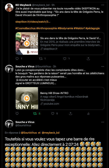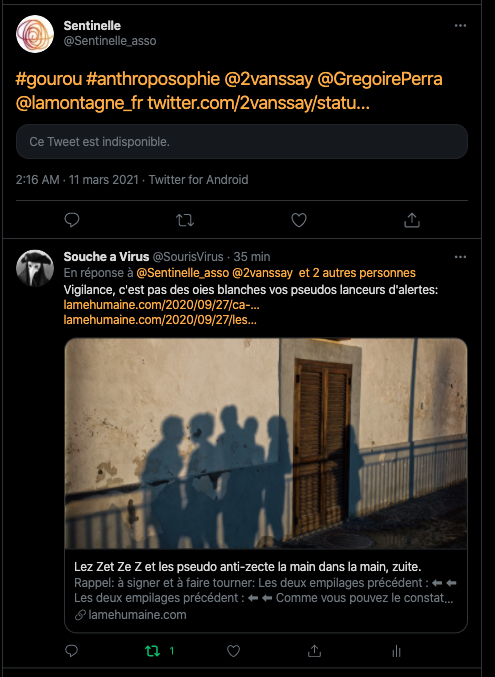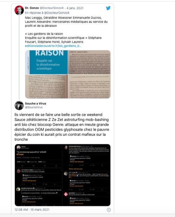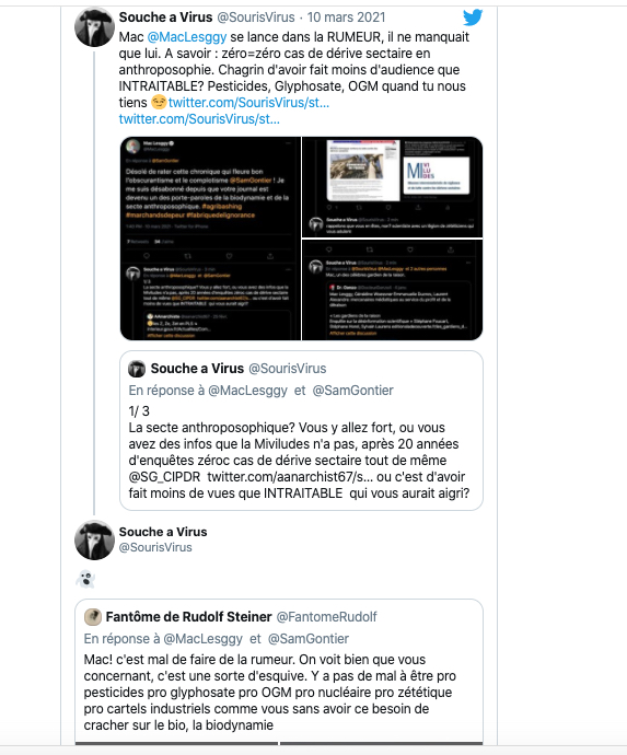 https://twitter.com/SourisVirus/status/1367820303146119168?s=20 & https://twitter.com/SourisVirus/status/1367826116568903681?s=20 & https://twitter.com/SylvainBucheron/status/1367830327977213954?s=20 & https://twitter.com/SylvainBucheron/status/1367834557563756546?s=20 & le sujet du jour étant la biodynamie au 13h, sur France 2 : https://twitter.com/SourisVirus/status/1367835409976336389?s=20 & https://twitter.com/SourisVirus/status/1367833551304077315?s=20 & https://twitter.com/SourisVirus/status/1367829074643718149?s=20 & https://twitter.com/SylvainBucheron/status/1367830730894675969?s=20 & les types me parlent encore de V🐀z+: https://twitter.com/SylvainBucheron/status/1367837754260922372?s=20 & https://twitter.com/SylvainBucheron/status/1367839234153975810?s=20 & https://twitter.com/SylvainBucheron/status/1367845255819759621?s=20 & https://twitter.com/aanarchist67/status/1367850270911299584?s=20 & https://twitter.com/HolmezZherlock/status/1367876573303607299?s=20 & https://twitter.com/DonMcMouse/status/1367882456276303886?s=20 & https://twitter.com/LaFactur/status/1367884915539402752?s=20 & https://twitter.com/LaFactur/status/1367816872339595265?s=20 suite à bloquage et masquage: https://twitter.com/DonMcMouse/status/1367887330535694340?s=20 & https://twitter.com/LaFactur/status/1367939651403669510?s=20 & https://twitter.com/LaFactur/status/1367946700623601665?s=20 & https://twitter.com/DonMcMouse/status/1368162636605571073?s=20 &