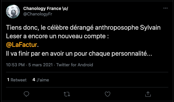 « Je parle plus fort et j’ai le dernier mot » et « On est plus forts que vous sur le web » commencent à s’effriter : un tweet du nouveau petit patron web de l’Afis est très parlant, lorsqu’il menace un de nos chers activistes écolo-national, le rapporte et le confronte en disant à un type : “je vais te lancer la meute aux fesses”… Incroyable, les mecs sont des fondus intégristes, ne se cachent même pas … tout ça fout les jetons.