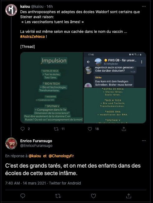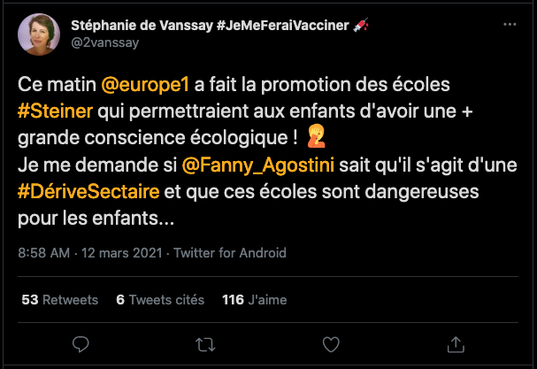 Et encore un mensonge éhontée de GP !!! comme d’hab’. L’article ne dit pas du tout cela et parle d’un type, qui lui n’est pas pour ce vaccin sans être d’ailleurs, contre tous les vaccins… : https://www.reuters.com/article/us-health-coronavirus-germany-anti-vacci-idUSKBN2A91KQ : « Je ne me ferai pas vacciner », a déclaré à Reuters Hueck, un généticien moléculaire qui a rédigé une série d’articles sur l’immunologie avant de changer de carrière.Aujourd’hui âgé de 59 ans, il forme des enseignants pour les jardins d’enfants Waldorf inspirés par le penseur ésotérique Rudolf Steiner, qui a débuté à Stuttgart. Il a également abordé plusieurs manifestations contre le verrouillage et contre la vaccination, bien qu’il ne rejette pas complètement les vaccins.«Je suis convaincu que si je devais être infecté n’importe où, je survivrai à la maladie», a-t-il déclaré à propos du COVID-19. «Je ne suis pas non plus vacciné contre d’autres maladies, sauf lorsque je voyage dans les tropiques où c’est obligatoire.»Près d’un tiers des Allemands, 31%, ont déclaré dans un sondage de décembre qu’ils ne prendraient pas de vaccin contre le coronavirus, un nombre qui passe à près de la moitié en France voisine. Donc un anthroposophe pour GP = Tous les anthroposophes… Pour rappel la position vaccinale de l’anthroposophie face au COVID est la suivante: https://www.ivaa.info/latest-news/article/article/anthroposophic-medicine-statement-on-vaccination-against-sars-cov-2/ et aux vaccins: https://www.ivaa.info/latest-news/article/article/anthroposophic-medicine-statement-on-vaccination/ plus d’infos là: https://twitter.com/superpopof/status/1357568697603416065?s=20