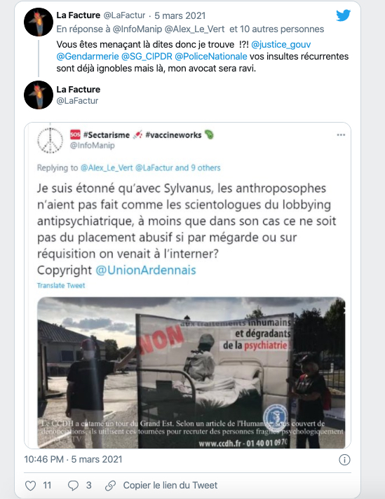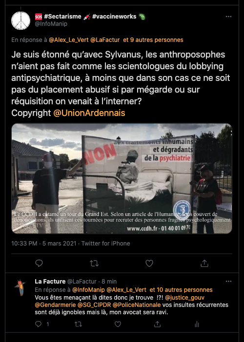 ⚖️ Tiens donc un pseudo anti secte très teigneux me menace de me faire enfermer à l’HP !?! Je les dérange et il vient de se nuire sévère là. Ça va pas plaire à mon avocat ça…