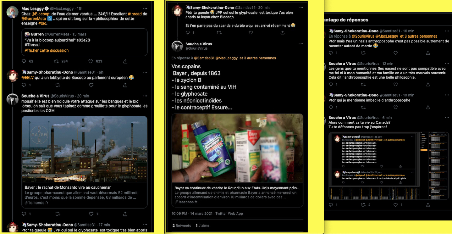 La bande à Bayer Monsatan, c’est pas joli joli...⬆︎ Gros boulot 2.0 ce weekend, Ils viennent de se faire une belle sortie sauce zététicienne Z, Ze, Zet astroturfing mob-bashing anti bio chez biocoop Genre: attaque en meute de la grande distribution: OGM, pesticides, Glyphosate, chez le pauvre épicier du coin ki aurait pris un sale contrat mafieux sur la tronche.. un Gros Tweet Poisseux, genre 10 000 engagements. Impossible à contrer, juste à constater.