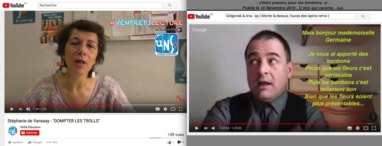 Les voici donc, ce couple farouchement altruiste (Lol.) sur des videos Youtube, captures d’Ă©crans faites le 18 novembre et que j’ai un peu re dĂ©corer Ă ma sauce tellement c’est risible parfois. Ces personnages ont fait de multiples signalements afin de faire sauter cela de mon Facebook, il ne l’ont pas fait sur Twitter, le feront t’il ici ? J’ai hĂąte qu’un juge voit tout cela: mon avocat Ă bien ri.