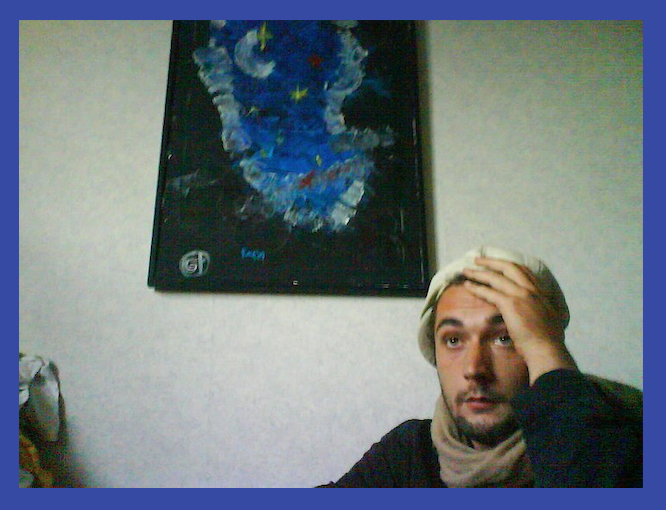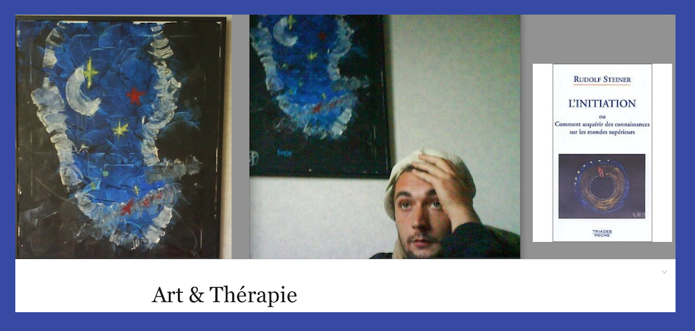 Un jour jâĂ©tais invitĂ© Ă lâexposition de feu Guilain, en photo au dessus, un garçon que jâaimais Ă©normĂ©ment car il mâavait choisit comme confesseur et accompagnant = « MĂ©diateur de santĂ©-pair », jâĂ©tais son parrain. Lorsque je suis arrivĂ© dans cet Ă©glise du mont Cenis (SacrĂ©-Coeur de Paris) ou plein dâartistes diffĂ©rents exposaient leur oeuvres, je suis restĂ© scotchĂ© en voyant cette toile mise Ă lâhonneur. Car Ă©trangement elle mâavait rappelĂ© la couverture de ce livre majeur de lâoeuvre de Steiner. Lui nâavait jamais entendu parler de Rudolf. Je me suis dit: ces deux oeuvres traitent de la mĂȘme chose mais lâune a lâair complĂ©tement en bordel. Je nâai pas lâanalyse de ces dessins qui reprĂ©senteraient de la cosmologie divine.
