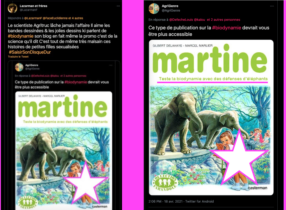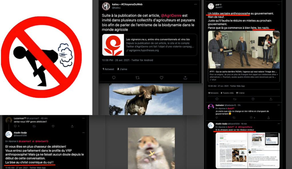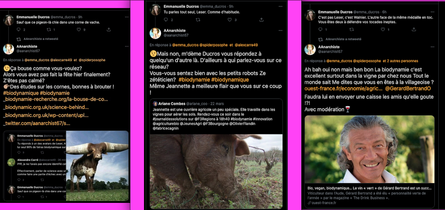 M’dème ducros: – « Tu réponds à un des avatars de Leser, Alexandre. Le gars qui produit a lui seul 90% de fatras biodynamique sur Twitter » & « Sauf que ce pigeon-là chie dans une corne de vache. » Que dire si ce n’est qu’elle chie par la bouche !?!