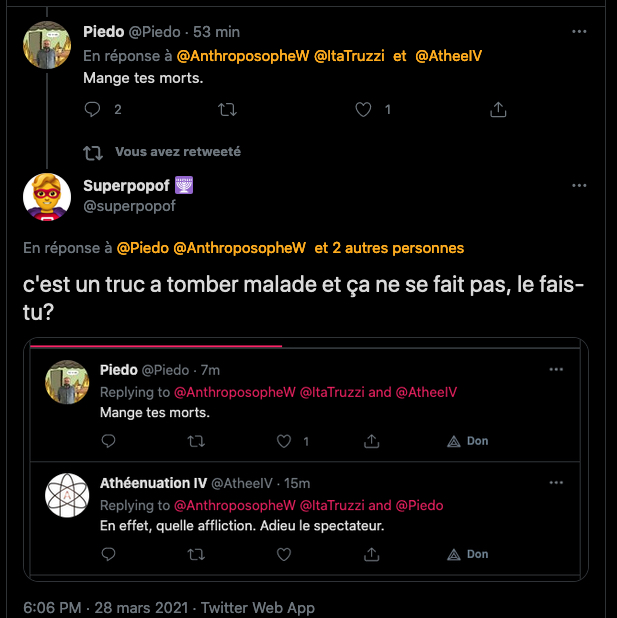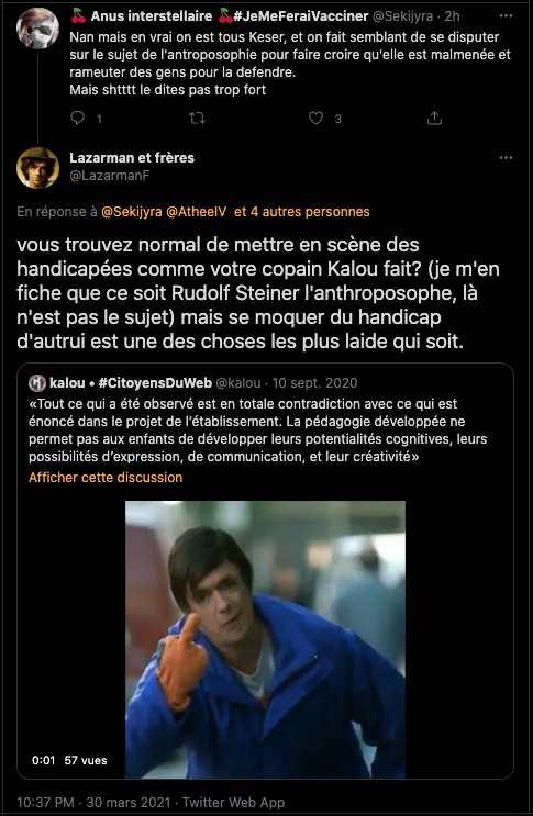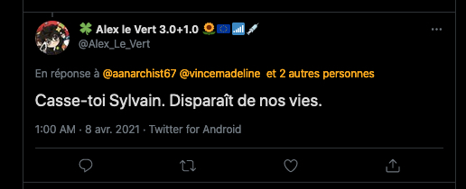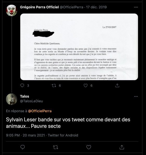 Vu qu’il a menacé ma famille et moi-même ces jours-ci, voici quelques infos sur ce pitre: 1 -Je ne suis pas la personne qui a ouvert ce compte, pas besoin de me faire traiter en plus de fils de pute par tes ami e s 2.0: https://twitter.com/TalosLeDieu/status/1373364480567021569?s=20 & https://twitter.com/TalosLeDieu/status/1373365097574379530?s=20 &