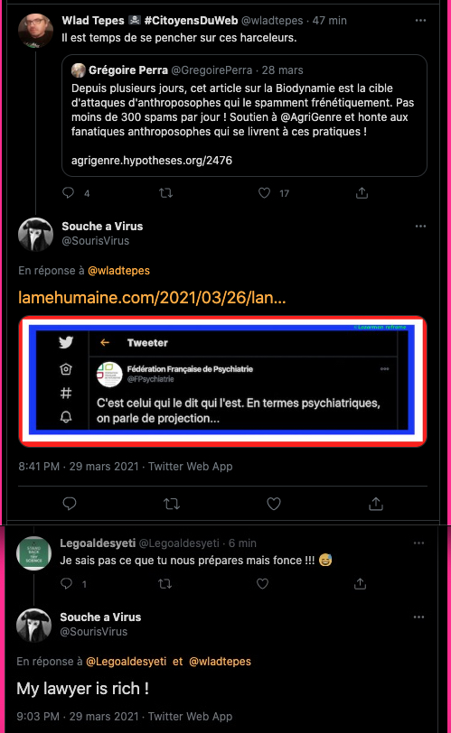 Lui, il est pas frais ! En effet, les copains de Grégoire sur le web sont des cas parfois sérieux : entre le gamin pro Ze qui avait fait une lettre d’adieu genre suicide sur Twitter et ce genre-là avec « bédoin à vélo » c’est pas clair non plus ! On sent bien que les Ze 2.0 sont des geeks perturbés et paumés, fragiles qui se sont inventé e s une chasse aux sorcières au lieu d’aller consulter des psys. Le plus grave, c’est que les chefs de file de l’agro-pétrochimie, sans scrupules, pro des intrants genre glyphosate, néonicotinoïdes, OGM, pesticides et autres saloperies à vendre sont en mission médiatique et les utilisent pour le bio bashing, l’anti biodynamie, l’anti anthroposophie intempestif et l’astroturfing, etc.