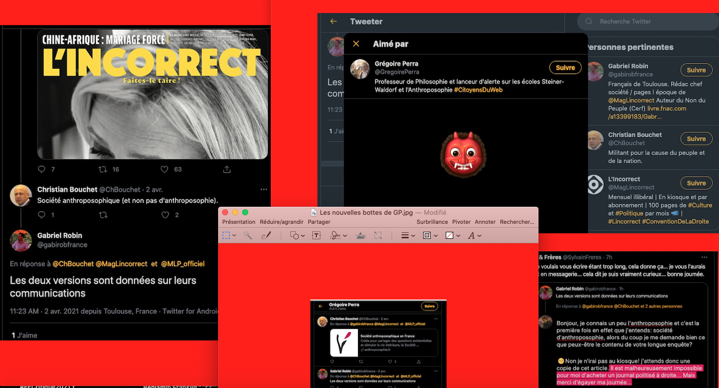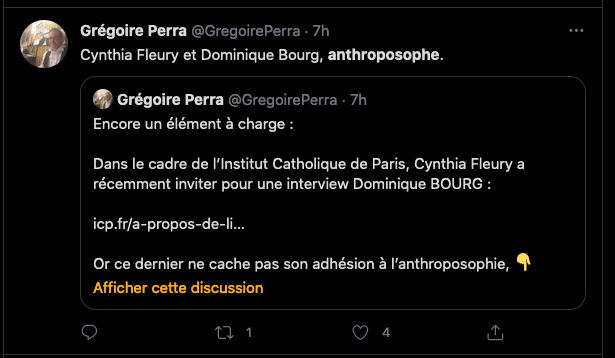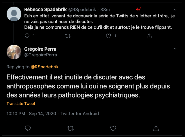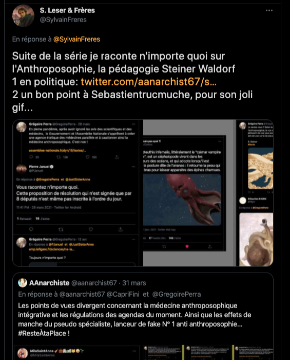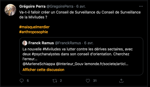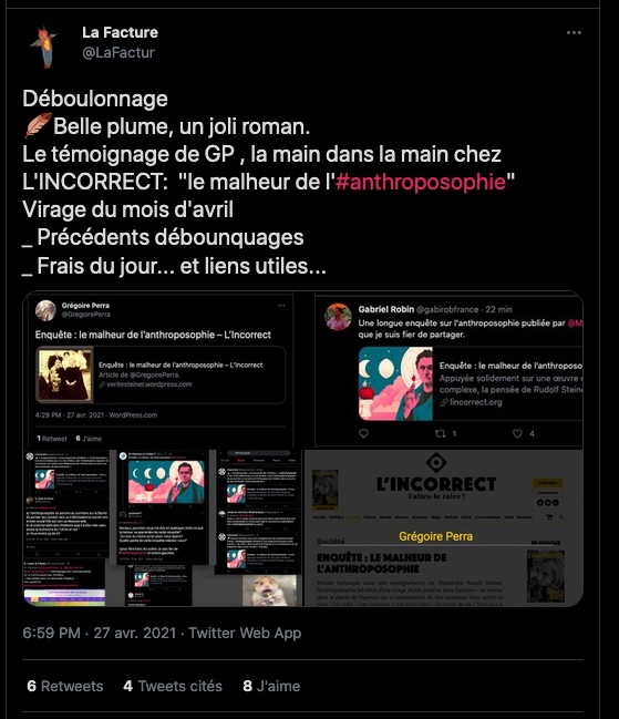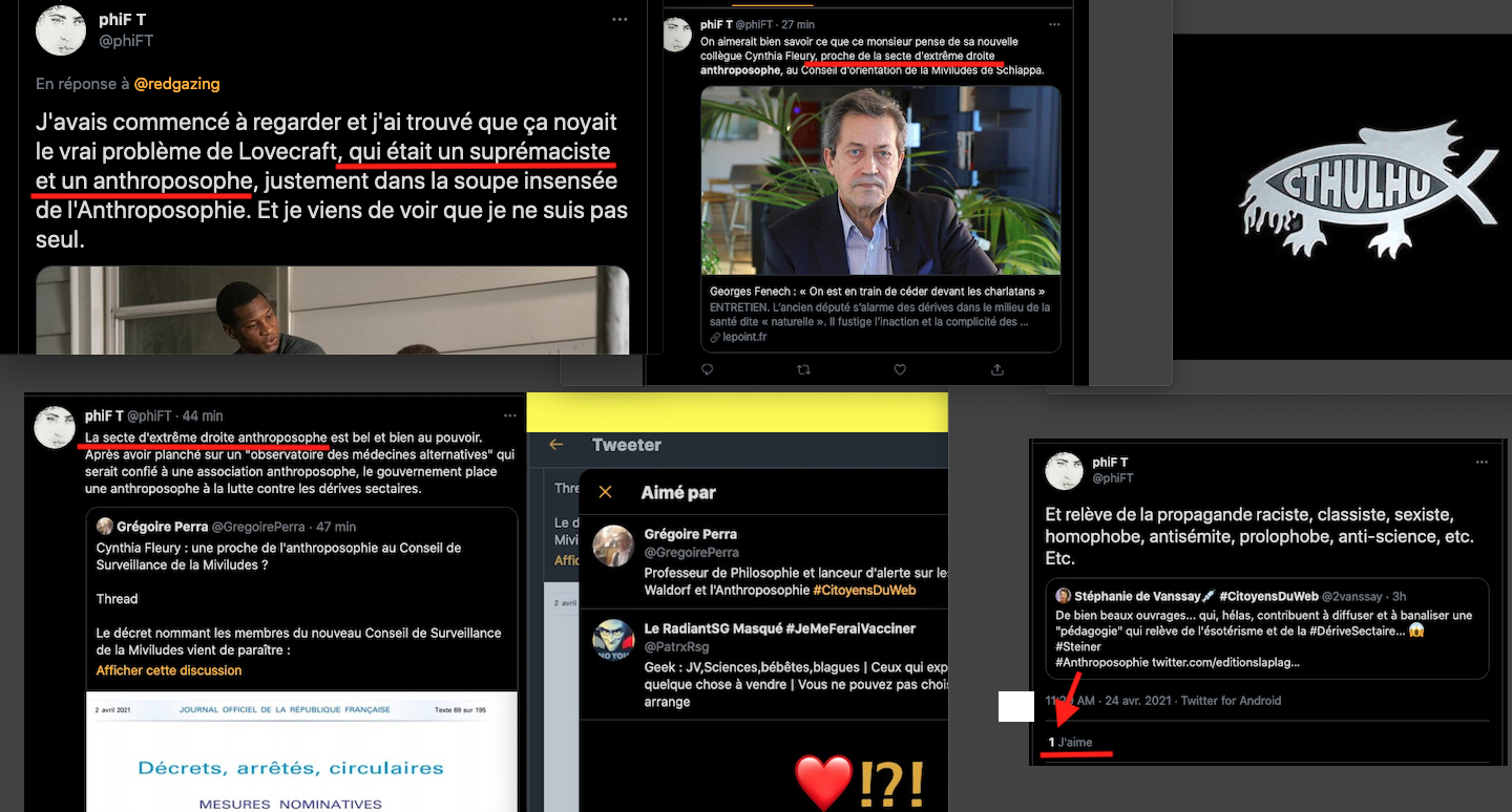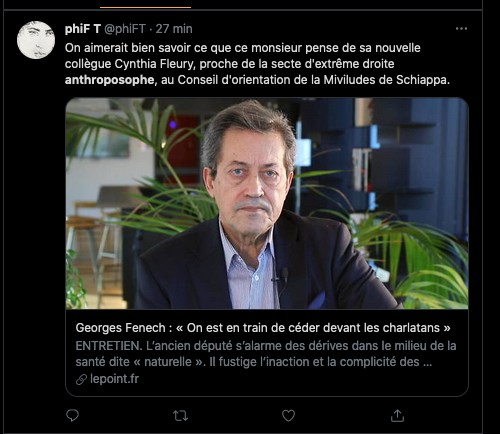 Tout ce qui grimpe redescend : GP est en pleine montée dans un délire pathologique et mystique… plus profond que la droite: le fascisme est en route. Il s’en prend à une psy qui serait proche de l’anthroposophie et au conseil de la nouvelle Miviludes, qui, pour l’instant, semble bien plaire au scientisme Ze. Tweets en vrac ⬇︎, allez donc voir par vous-même. Il nous fait un Thread frénétique, du véritable terrorisme intellectuel et tente, en plus, de faire à nouveau passer l’anthroposophie pour une secte et, cette fois, de l’extrême droite. C’est d’un pathétique. Alors qu’il est lui-même diffusé cette semaine chez M’dème Le Pen… : propagande et folie. La confusion totale : écrire l’Histoire sur Google tel un chasseur pendant que les lapins dorment…