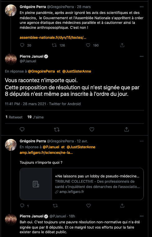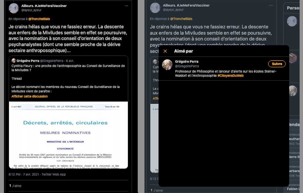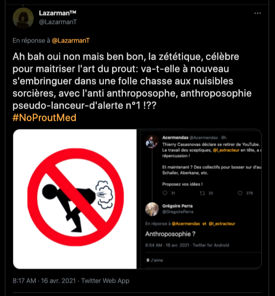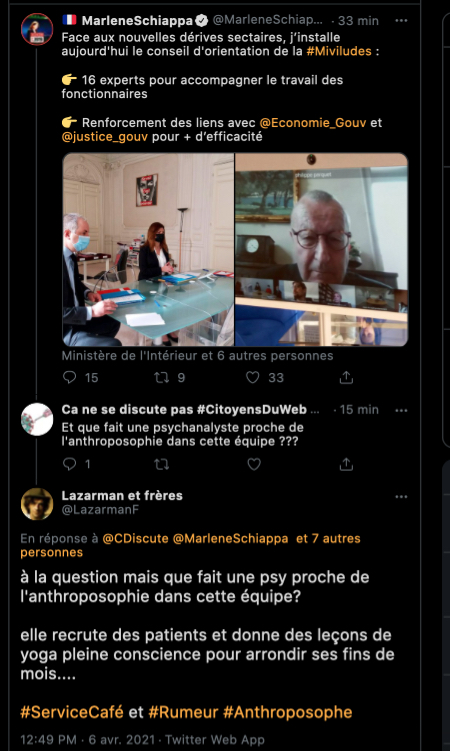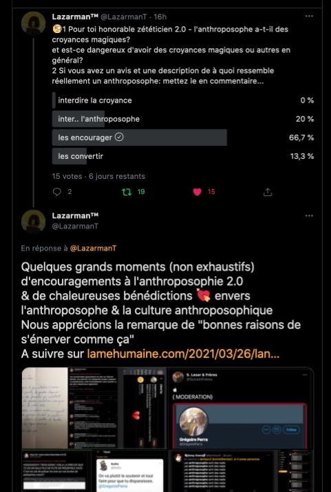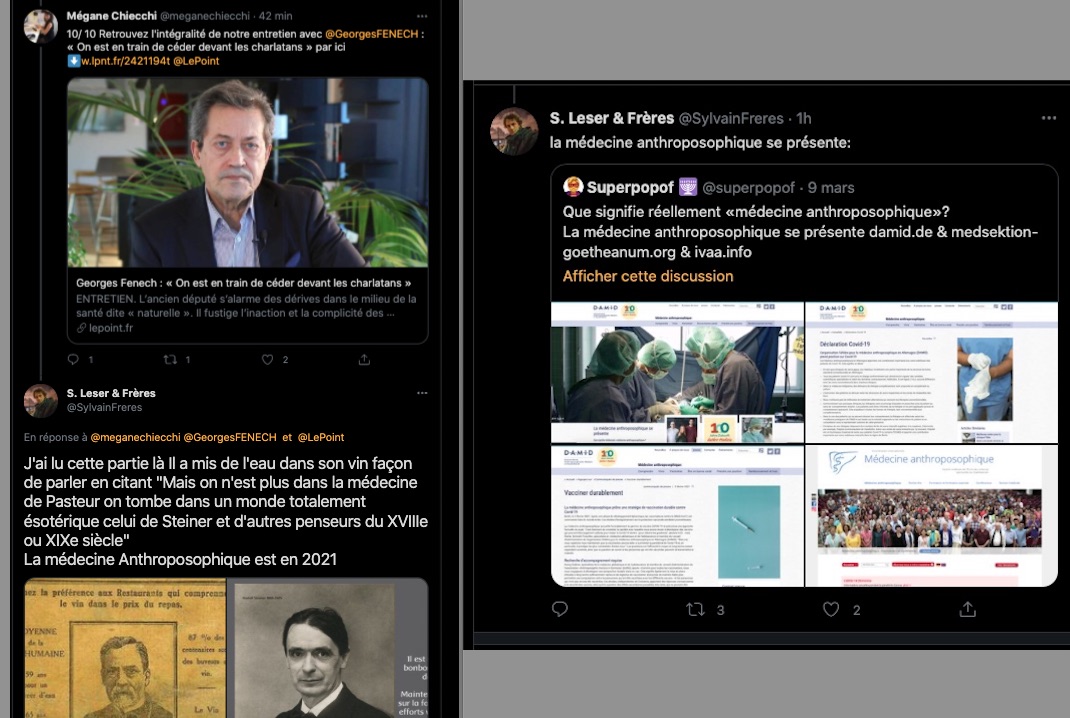 Tout ce qui grimpe redescend : GP est en pleine montée dans un délire pathologique et mystique… plus profond que la droite: le fascisme est en route. Il s’en prend à une psy qui serait proche de l’anthroposophie et au conseil de la nouvelle Miviludes, qui, pour l’instant, semble bien plaire au scientisme Ze. Tweets en vrac ⬇︎, allez donc voir par vous-même. Il nous fait un Thread frénétique, du véritable terrorisme intellectuel et tente, en plus, de faire à nouveau passer l’anthroposophie pour une secte et, cette fois, de l’extrême droite. C’est d’un pathétique. Alors qu’il est lui-même diffusé cette semaine chez M’dème Le Pen… : propagande et folie. La confusion totale : écrire l’Histoire sur Google tel un chasseur pendant que les lapins dorment…